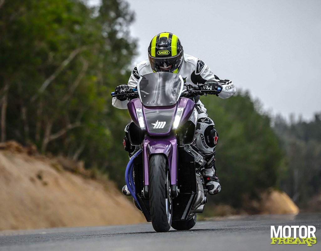 roteert en daarmee het gyroscopisch effect heeft gereduceerd. “We begonnen met de 6-bak van de Kawa omdat we die over hadden nadat we de cilinderbanken voor de V8 hadden gebruikt,” zegt Messina. “Maar we hebben de 6e versnelling verwijderd omdat we niet zoveel overbrengingen nodig hadden en hebben het in plaats daarvoor gebruikt voor de cardanaandrijving.” Drooggewicht is geclaimd op 265 kg met een gewichtsverdeling van 50/50%, gelijk aan een afgetankte Hayabusa, maar dan zonder benzine.