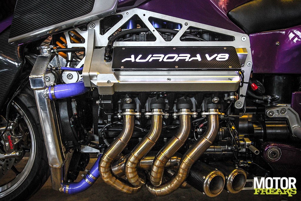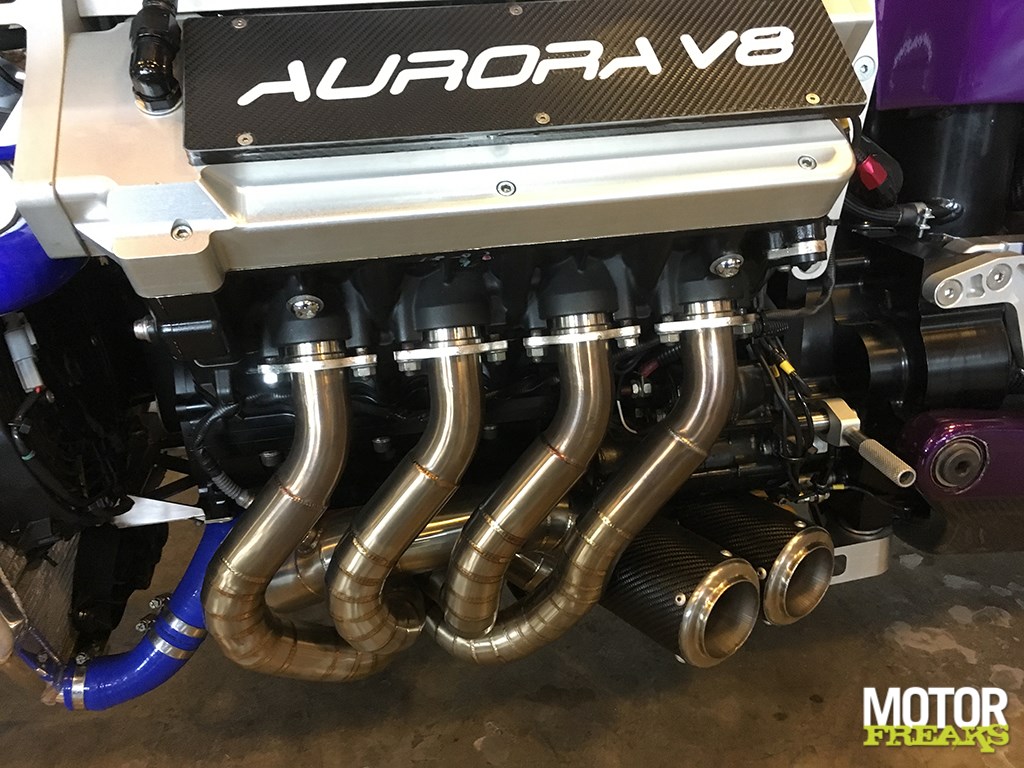 De vloeistofgekoelde Aurora V8 eendelige krukas is gemaakt door Prototipo in NZ en heeft uit massief staal gefreesde drijfstangen die in Argentinië door Saenz zijn gemaakt. De Wiseco zuigers uit de VS zorgen voor een compressieverhouding van 12:1 en lopen in Nikasil gecoate cilinderblokken van de Kawasaki ZX-12R, die op Messina’s zelf ontworpen carters zijn gemonteerd. De Kawasaki cilinderkopen en nokkenassen die op de originele 2,4 liter V8 waren gemonteerd hebben het veld geruimd voor Aurora’s eigen ontwerp, terwijl de 46mm gasklephuizen – acht stuks in totaal, met enkele injector vlak boven de vlinderklep gemonteerd, door Jenvey Dynamics in de UK zijn gemaakt en voorzien van hun eigen