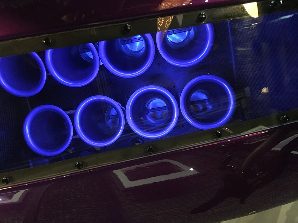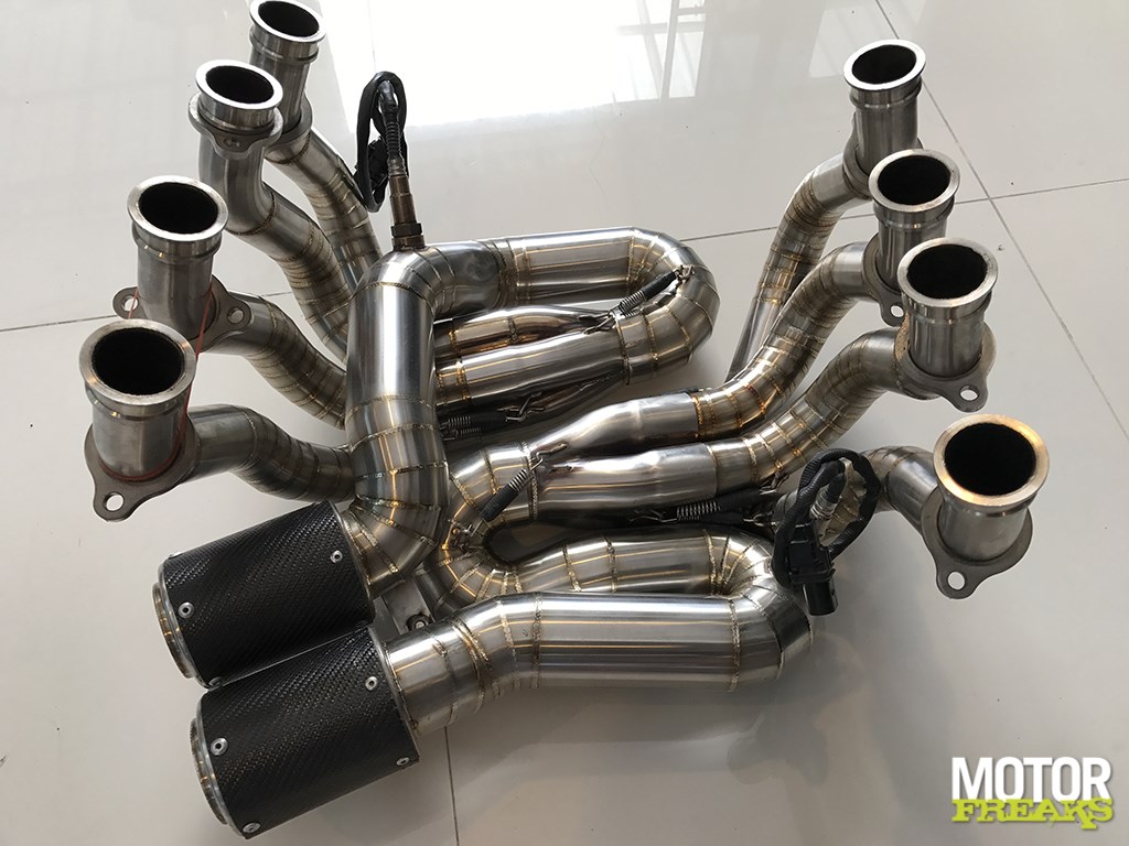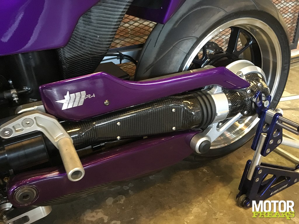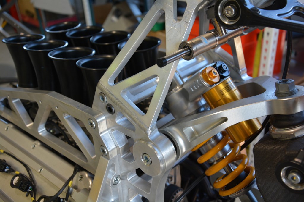 “De motor in Thailand ontwikkelen heeft me meer tijd gegeven om aan het concept te werken, en de issues. Gewoon dingen als de versnellingsbak namen 2 jaar in beslag – het heeft een eigen oliepomp apart van blok, dus er wordt geen olie verspild. De koppeling tegengesteld te laten draaien om de gyroscopische krachten van het blok te compenseren nam behoorlijk wat tijd in beslag, hetzelfde geldt voor de carbon koppeling, de multilink achtervering en de carbon fiber cardan behuizing. Plus, je kunt geen motor verkopen als ‘ie niet mooi klinkt – en geluid is altijd belangrijk geweest. Ik wilden een V8 die klinkt als een Ferrari en met de 80° V klinkt ‘ie als een agressieve Ferrari, dus dat is geweldig! Dat is waarom de uitlaatpijpen allen aan dezelfde kant zitten, wat een nachtmerrie is voor elke ontwerper. Maar het geluid is werkelijk uniek, mechanische muziek!”