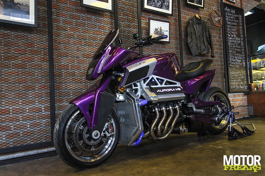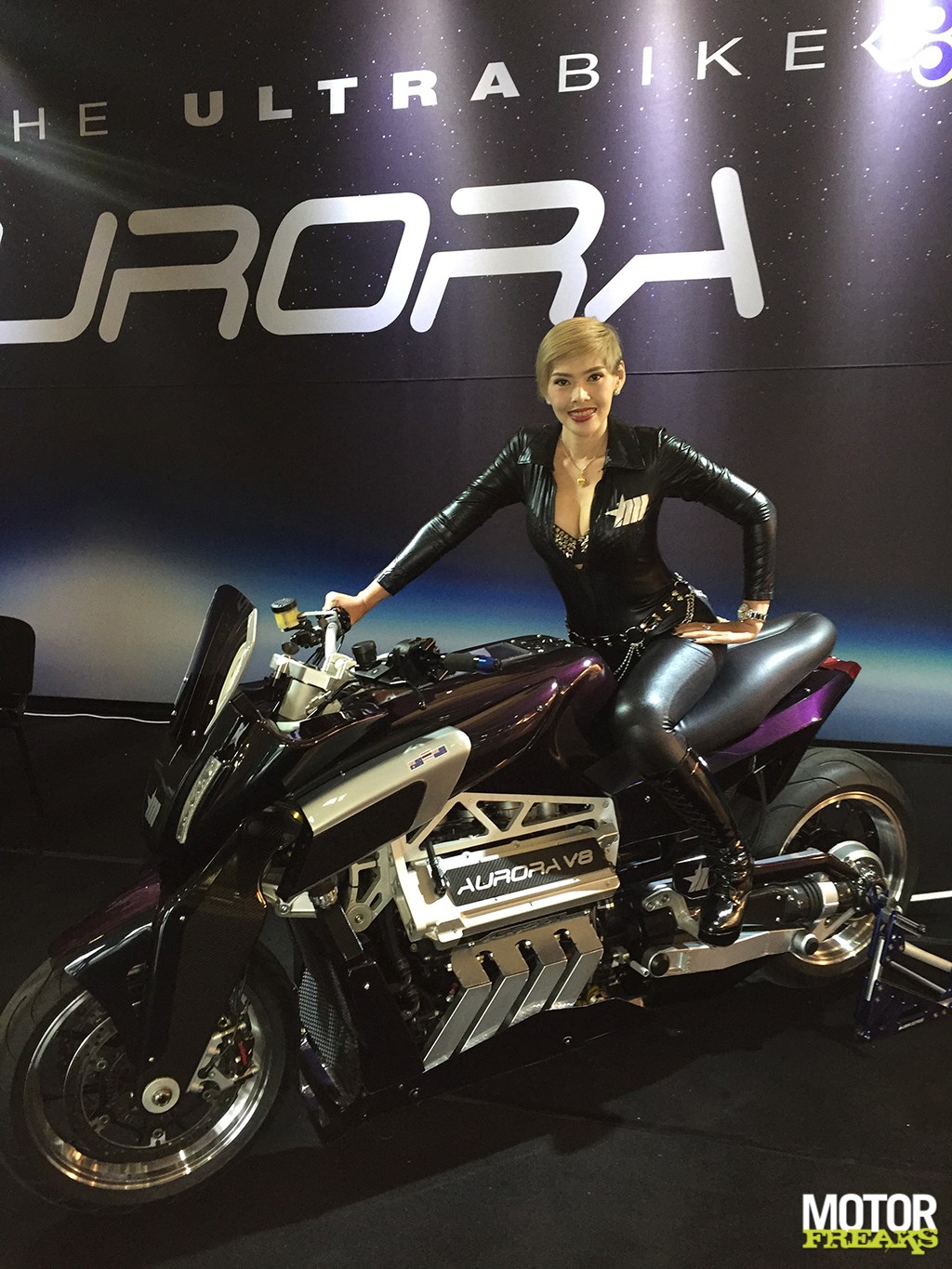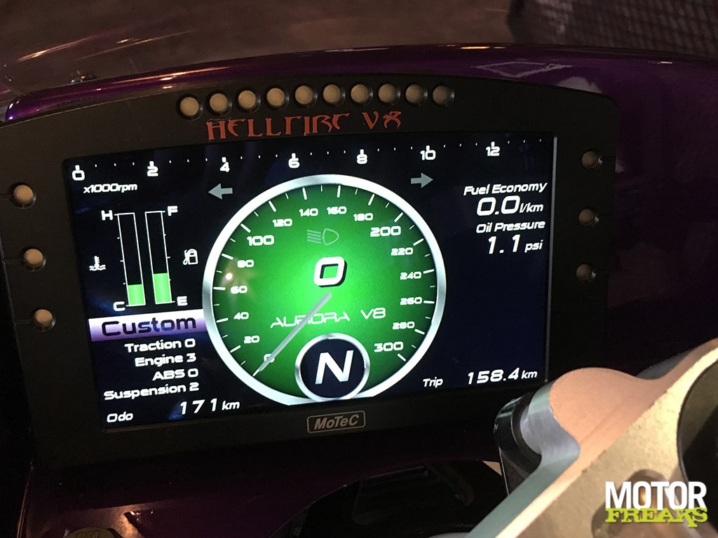 De Aurora Hellfire V8 maakte z’n werelddebuut ergens in een hoekje van de 2015 EICMA in Milaan, zonder dat er ooit met de motor was gereden of zelfs was gestart. “Ik vroeg de organisatoren om ons op een mooie plek neer te zetten, met als argument dat ze graag een compleet nieuwe V8 in de hoofdrol wilden hebben – maar in plaats daarvan werden we ergens aan het uiteinde van een verre hal in een hoekje met amper licht gedumpt, naast de deur die werd gebruikt om het afval naar buiten te doen,”