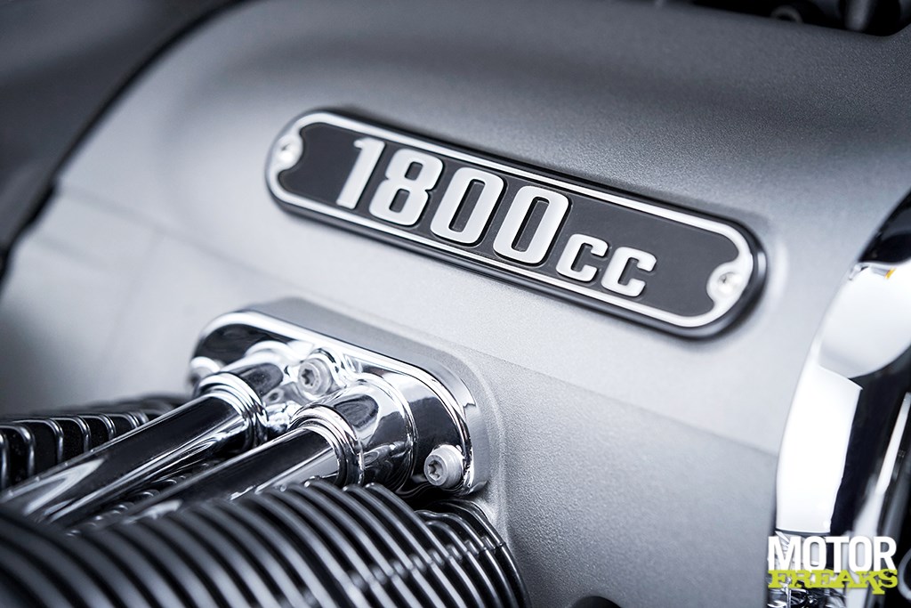 De aandrijflijn lijkt echter historisch, met zijn ronde, aluminium behuizing en zijn ontblote cardanas. Achter alle covers schuilt echter een modern, lucht/olie gekoeld motorblok dat aan de euro 5 emissienormen voldoet, mede dankzij een closed-loop driewegkatalysator. Het blok heeft een cilinderinhoud van 1802cc met een boring van 107,1 mm bij 100 mm slag, dus de boring-slagverhouding is ietwat overvierkant. De cilinderwanden zijn gecoat met een NiCaSil-coating voor een goede slijtvastheid, de zuigers hebben twee compressieveren en één olieschraapveer. Het motorblok loopt met de compressieverhouding van 9,6 : 1, wat vrij laag is voor een modern motorblok. Dat hij op benzine met een octaangetal van 95 mag lopen is dan ook niet zo bijzonder.