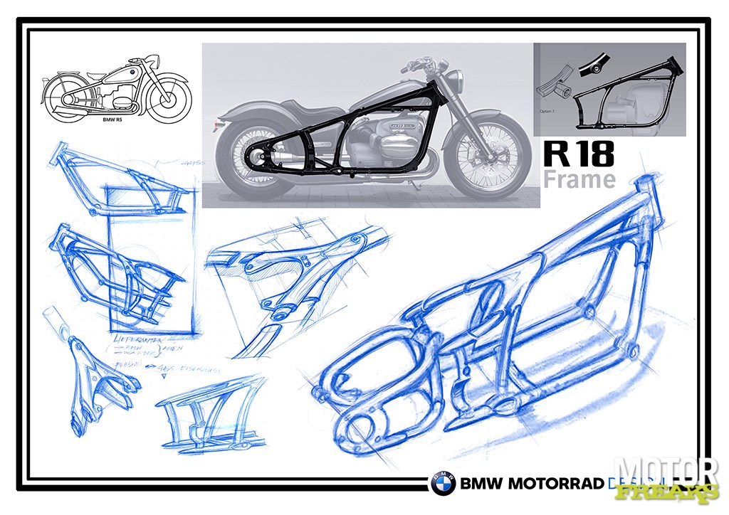 Voor de ontwikkelingsafdeling van BMW was het een behoorlijk uitdagende klus om moderne technologie en indrukwekkende prestaties te verstoppen in een klassiek design, waarbij toch wel de nodige compromissen werden gesloten om de motor geschikt te houden voor de eisen van de 21e eeuw. Zo heeft de R18 heeft geen trommelremmen maar schijfremmen. Het origineel had plunjervering op het achterwiel. Ook dat heeft de R18 niet. Het lijkt alsof de motor een hard-tail heeft, maar in werkelijkheid is aan het uit stalen buis en gegoten en gesmede delen vervaardigde, dubbele wiegframe een scharnierend achterframe met cantilever monoschokdemper bevestigd. Deze constructie laat een veerweg van 90 mm toelaat. Onder de voorvorkcovers huist een 49 mm telescoopvoorvork met instelbare veervoorspanning en veerwegafhankelijke demping. De veerweg is 120 mm. De voorvork staat met een balhoofdhoek van 57,3° behoorlijk onderuit, de naloop is met 150 mm ook erg lang. Afwijkend is verder dat de R18 geen zweefzadel heeft, maar een op het frame bevestigde monoseat met een zithoogte van 690 mm. Verder heeft ook het oude duplo-lampje plaats moeten maken voor LED-verlichting, als optie is zelfs adaptieve bochtverlichting op de R18 leverbaar. Dit systeem werkt bij een snelheid van meer dan 10 km/h en een hellingshoek van 7° of meer.