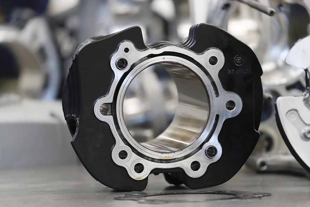 In het onder de motorbehuizing geschroefde carter zit een oliefilter-cartridge, die zover in de behuizing is verzonken dat je hem niet ziet. Op het motorblok zelf zit een huis met twee membranen, die de lucht, die door het pompen van de twee tegenoverliggende zuigers wordt gecomprimeerd, weg kan sluizen en die voor een zeker vacuüm in het carter zorgt. Dit vermindert de pompverliezen en zorgt voor een laag olieverbruik. Het motorblok weegt kaal 107 kg, met airbox en gasklephuizen weegt het 110,8 kg. Er gaat 4,1 liter 5W/50 olie in. Dat is relatief veel, omdat de olie ook voor de koeling zorgt, waarbij de olietemperatuur in het gareel wordt gehouden via een oliekoeler. Onder in het wet-sump-carter zitten dan ook twee ketting-aangedreven oliepompen, de ene zorgt voor de smering, de andere voor het koelcircuit.
