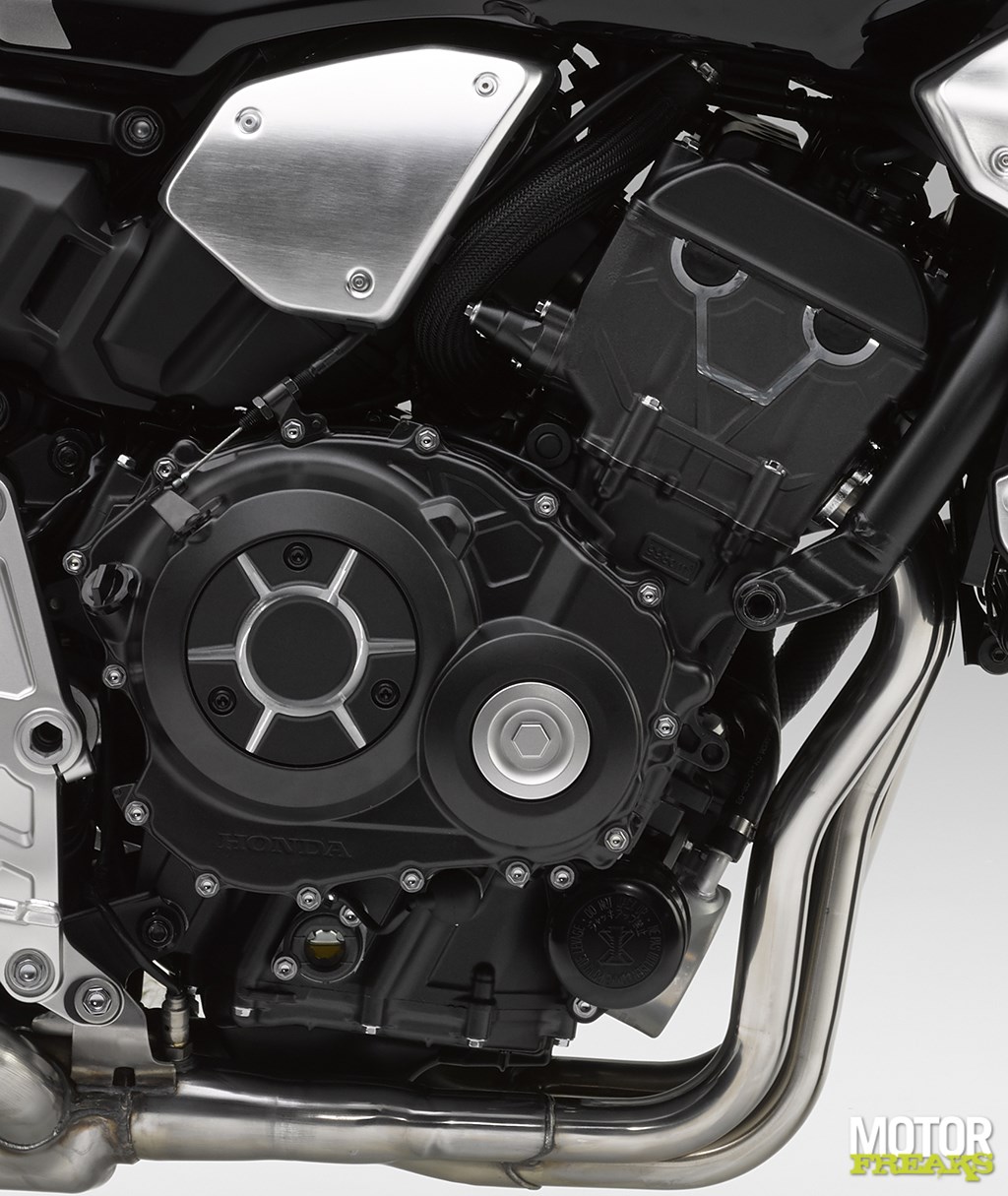Dat de nieuwe CB1000R ondanks Euro4 zo significant sterker is dan z’n voorganger zit ‘m vooral in de betere ademhaling. Zo is van het profiel van zowel de in- en uitlaatnokkenas de lift verhoogd naar 8,5 en 8,1 mm (was 7,9 / 7,8 mm in/uit), is het gasklephuis maar liefst 8 mm groter (44 mm ) gemaakt en is de vorm van de verbrandingskamer geoptimaliseerd. Om nog maar te zwijgen over de airbox, luchtinlaten en het luchtfilter, evenals het 4-2-1 uitlaatsysteem dat compleet is vernieuwd en ook nog eens 4,5 kilo lichter is. Een verbindingspijp tussen de 2 hoofdpijpen vlak voor de katalysator moet voor een boost van koppel