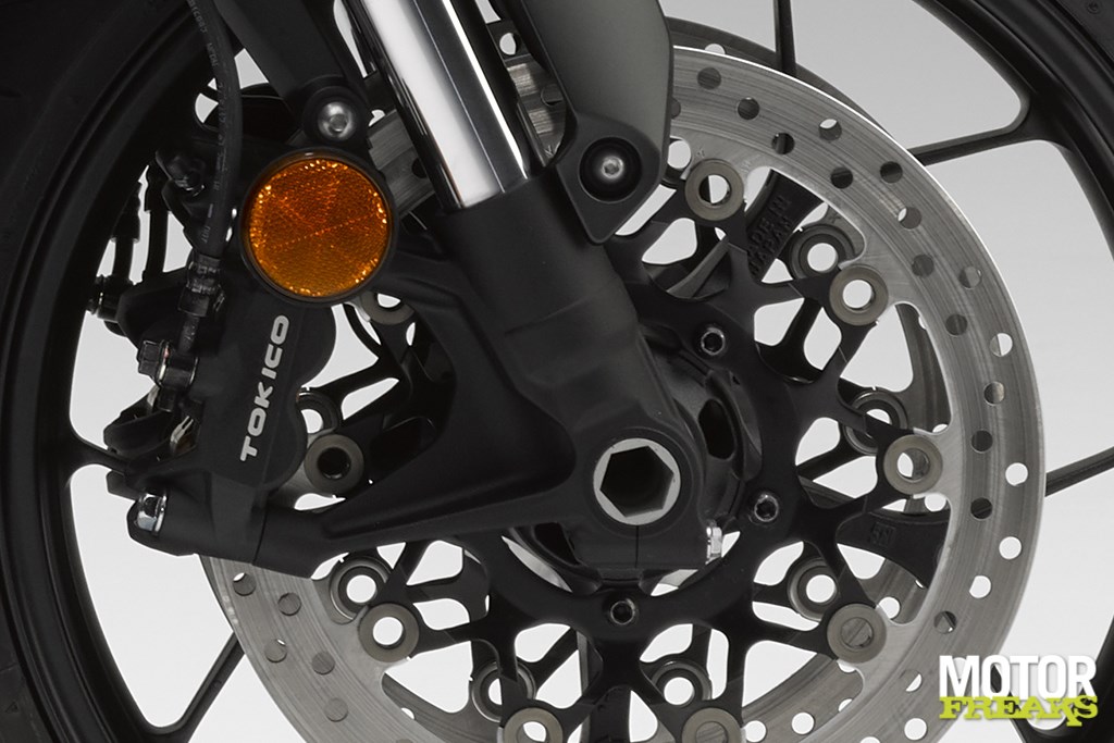 Wat vering betreft heeft Honda (uiteraard) een beroep op de firma Showa gegaan. Aan de voorkant vinden we een Showa Seperate Function Fr Fork Big Piston unit terug (da’s een hele mond vol, maar je mag ook gewoon SFF-BP zeggen), waarvan de demping in een poot is ondergebracht. Dat scheelt weer gewicht. Volgens Honda is de voorvork geschikt om in een breed scala een rijcondities optimaal te presteren. De Showa achtershock is eveneens volledig instelbaar. In het voorwiel zijn twee 310 mm zwevende schijven met radiaal gemonteerde 4-zuiger remklauwen voorzien, het achterwiel wordt door middel van een enkele 256 mm schijf met 2-zuiger remklauw afgeremd. De 6” brede achtervelg is nu van een 190/55 ZR 17” achterband voorzien, die de 180/55 ZR 17” van de oude vervangt.