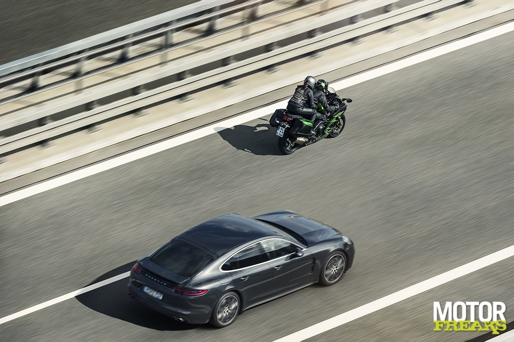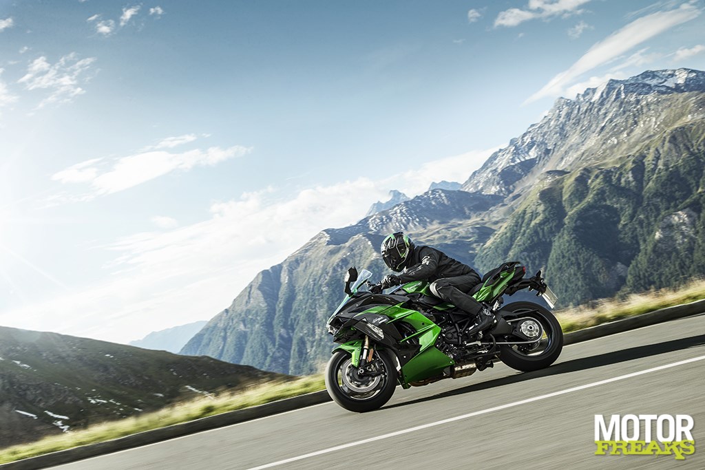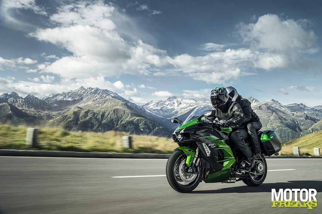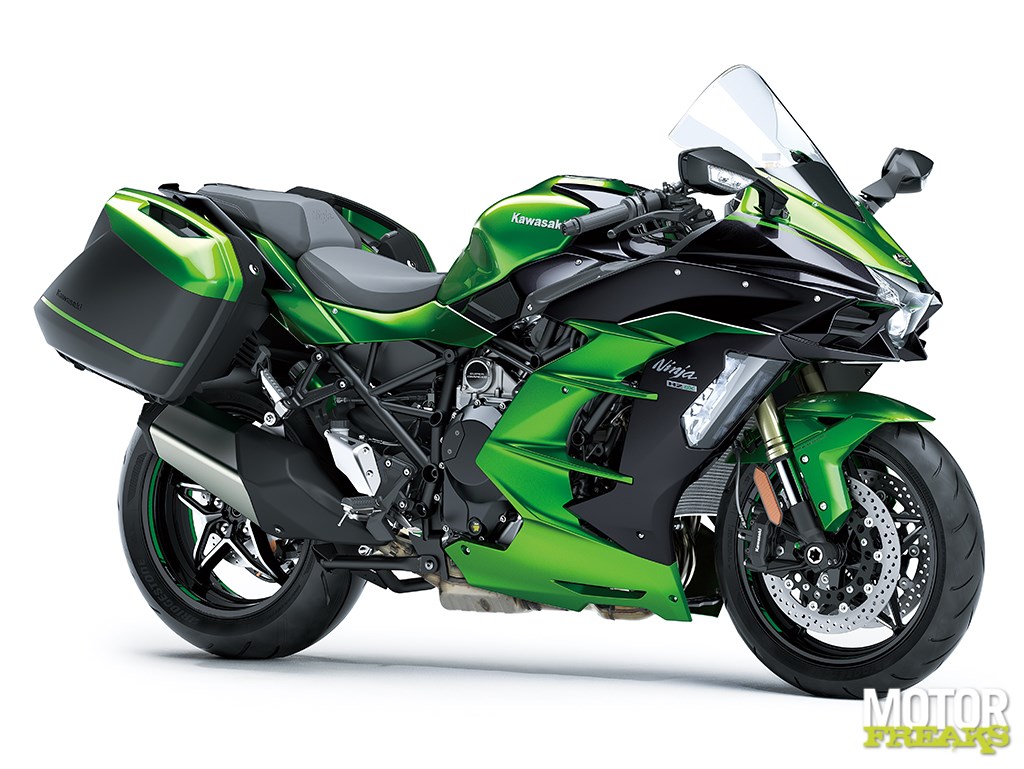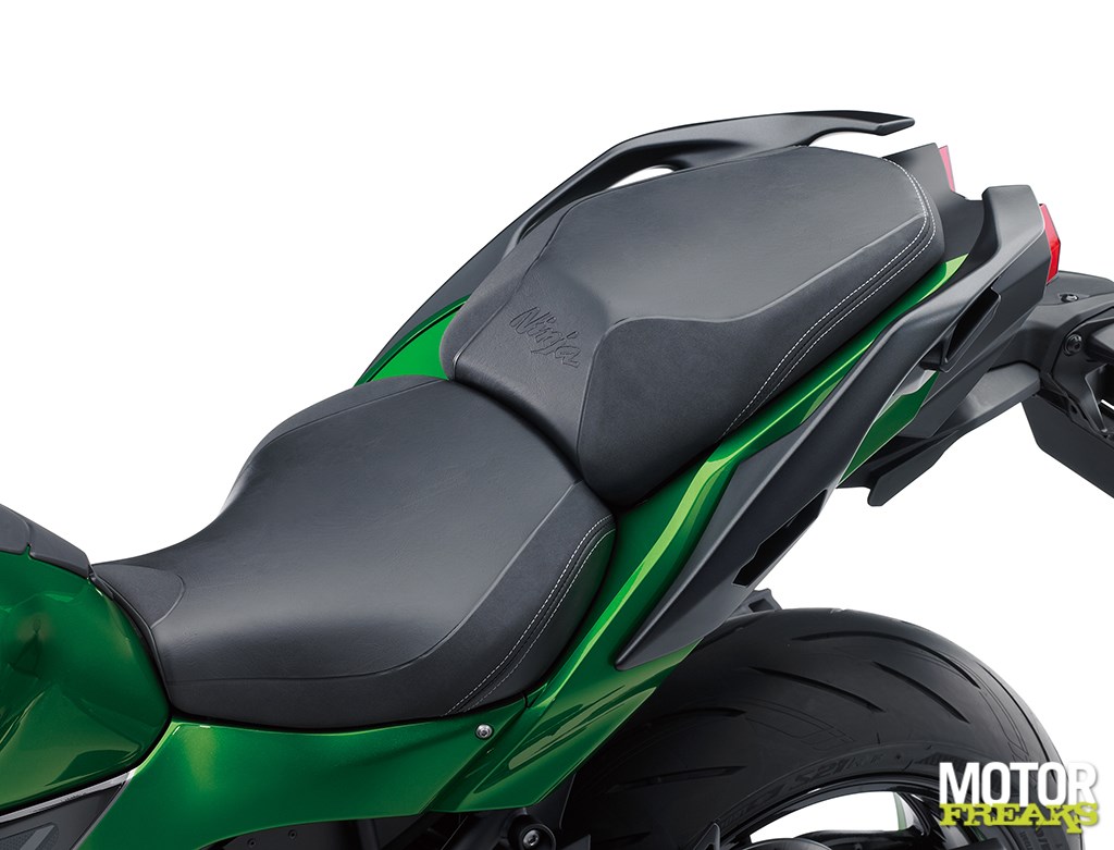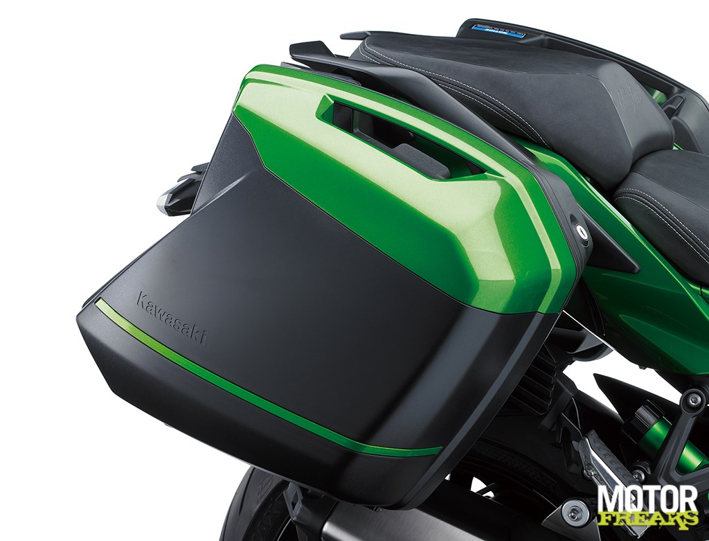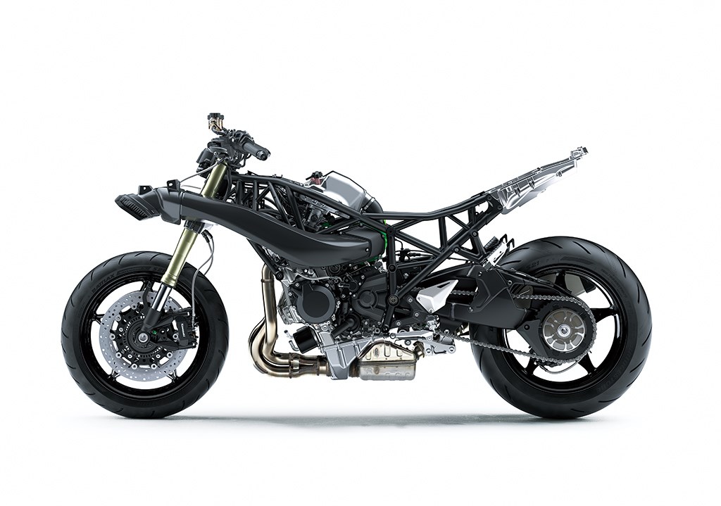 Terwijl bij ‘team motorblok’ hard aan het Balanced Supercharged Engine (volgende keer een compactere naam verzinnen, goed?) werd gewerkt lag bij chef rijwielgedeelte volledig de focus op een nieuw frame dat voor 2 personen plus bagage geschikt moest zijn. En dus zien we hier eenzelfde vakwerk buizenframe als op de Ninja H2, met dat verschil dat het subframe nu stukken zwaarder is uitgevoerd. Volgens Kawasaki heeft het subframe een draagcapaciteit van 195 kilo (105 kg voor de Ninja H2), vergelijkbaar met die van de Z1000SX. Om op de snelweg ook op hoge snelheid met koffers nog voldoende stabiliteit te kunnen garanderen heeft Kawasaki de stijfheid vergroot en de wielbasis verlengd. Om nog wat dieper in de materie te gaan: het balhoofd is 15 mm verder naar voren geplaatst, waardoor de stuuruitslag met 3° naar nu 30° naar beide zijden kon worden vergroot. En dat scheelt weer bij het keren op de weg.