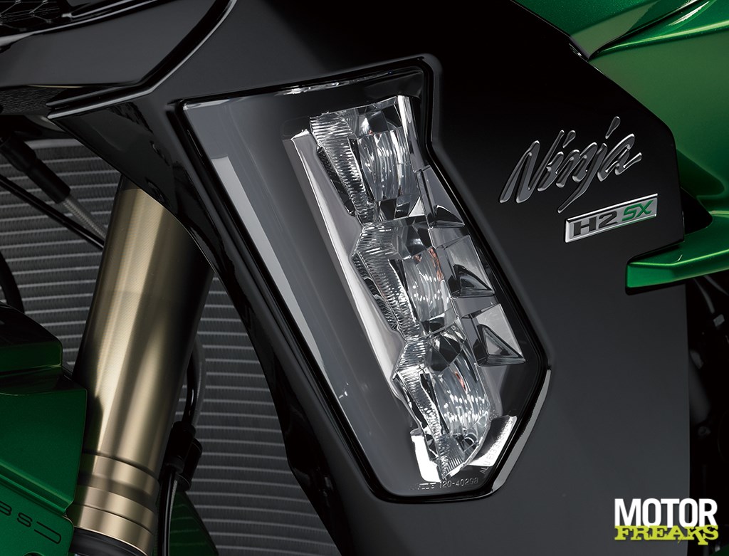 Het neusje is duidelijk een knipoog naar de Ninja H2, maar draagt wel bij aan het kolossale aanzicht. Net als het brede kontje met zwaar ogend subframe. De LED koplamp is ook op de Ninja H2 gebaseerd, maar dan net effe wat anders en aan de bovenkant van LED dagrijverlichting voorzien. Trouwens, over verlichting gesproken, alle verlichting op de Ninja H2 SX is LED, tot aan de kentekenplaatverlichting toe.