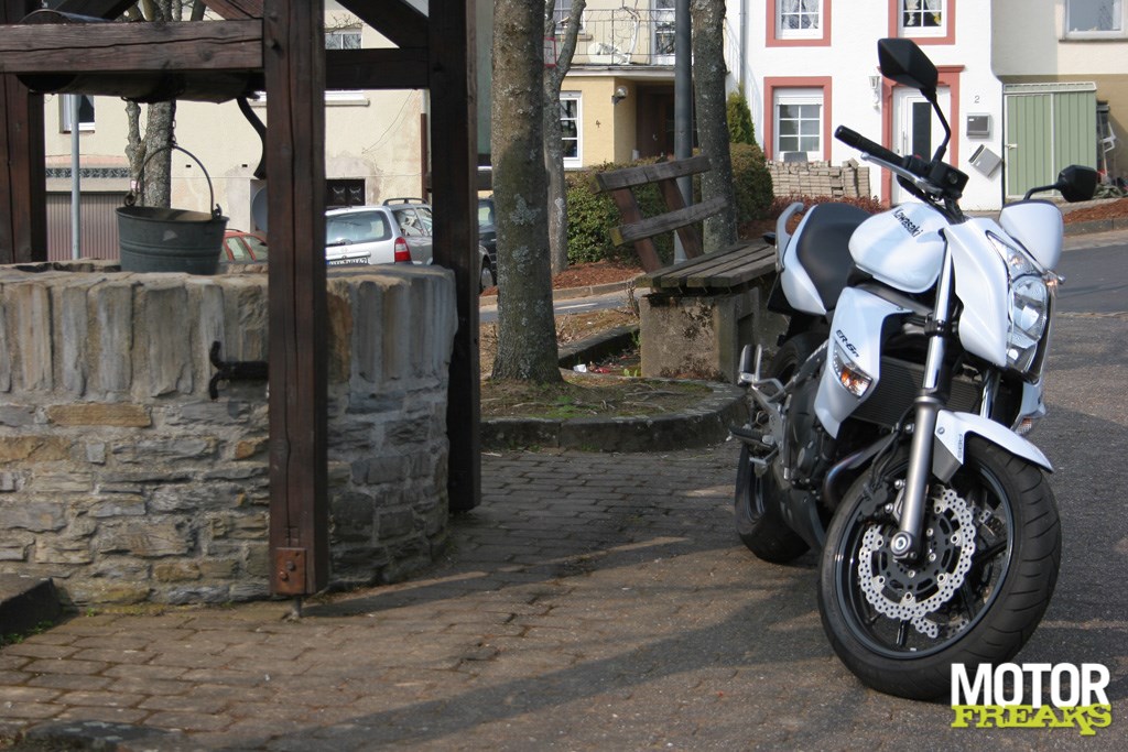 Stevig pokend in de hogere toerentallen maak je al snel een flinke snelheid op de twin. Als enige in de test is de Kawasaki voorzien van ABS remmen. Dit overbekende anti-slip systeem geeft, hoe het in de praktijk ook werkt, altijd een onbewust gevoel van veiligheid waardoor je gewoon wat zekerder in het zadel zit. Hierdoor durf je in het algemeen wat sneller hard te remmen dan op motoren die dit systeem ontberen. Dit geschreven: de remmen op de witte tweecilinder doen hun taak goed, maar zijn niet de beste van het stel. Misschien omdat het ABS systeem redelijk snel ingrijpt. De stevige, maar duidelijk communicerende vering van de ER-6n maken het sportieve plaatje af. De Kawa ligt lekker stabiel in de bochten ook op slecht wegdek. De wat straffere vering geeft onregelmatigheden in het wegdek duidelijk door, maar het wordt niet snel oncomfortabel. Mocht ik de ER-6n naar eigen smaak vormgeven dan zou beginnen met een ander stuur. Het huidige stuur voldoet prima, maar is toch wel erg smal en naar achter geplaatst. Alsof hij uit je navel groeit zeg maar. Het stuur iets verbreden en naar voren kantelen zou, naar mijn mening, het sportieve stuurgedrag alleen maar ten goede komen.