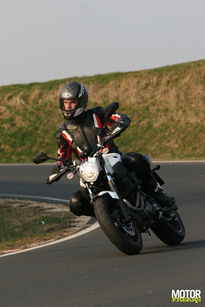 waar je aan het begin aan moet wennen, versterkt dit gevoel alleen maar. Als je het gas opendraait schiet het voorwiel direct de lucht in, doe je dit in omgekeerde volgorde kan het achterwiel nog wel is blokkeren. Hoewel deze eigenschappen nou niet echt overkomen als veilig of controleerbaar zorgt de zitpositie en de geometrie van de 03 er voor dat dit juist wel zo is. Het gematigde maar voldoende aanwezige vermogen zorgt ervoor dat je op deze motor heel veel lol kan hebben zonder dat de rijervaring grensoverschijdend wordt.