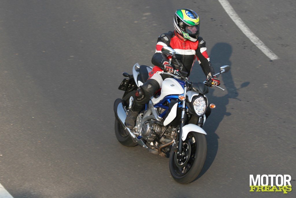 De Gladius is geen sprintkampioen maar de opgegeven 72 PK zijn zeker in huis. Lekker accelererend zit je zo op snelheid. De twin is levendig en nodigt, samen met het rijwielgedeelte - een zogeheten vakwerkframe, alsof de rest prutswerk is - uit tot speels rijden. Rustig tokkelend maar ook van bocht naar bocht tussen 6.000 en 9.000 tpm, op beide vlakken voelt de Gladius zich goed. Waar ik zelf veel plezier aan beleefde was het inspelen/bespelen op/van* Suzuki's DPS, oftewel 'Dash Pot System'. Dat moet de motorrem - kenmerkend voor tweecilinders - indammen door het toerental bij abrupt 'gas dicht' kunstmatig langzaam naar stationair te laten verlopen (geholpen door een iets zwaardere krukas). Dus lekker gas er op, gas dicht (hij gaat dan niet direct op zijn neus staan..), insturen en zo min mogelijk remmen, fun gegarandeerd!