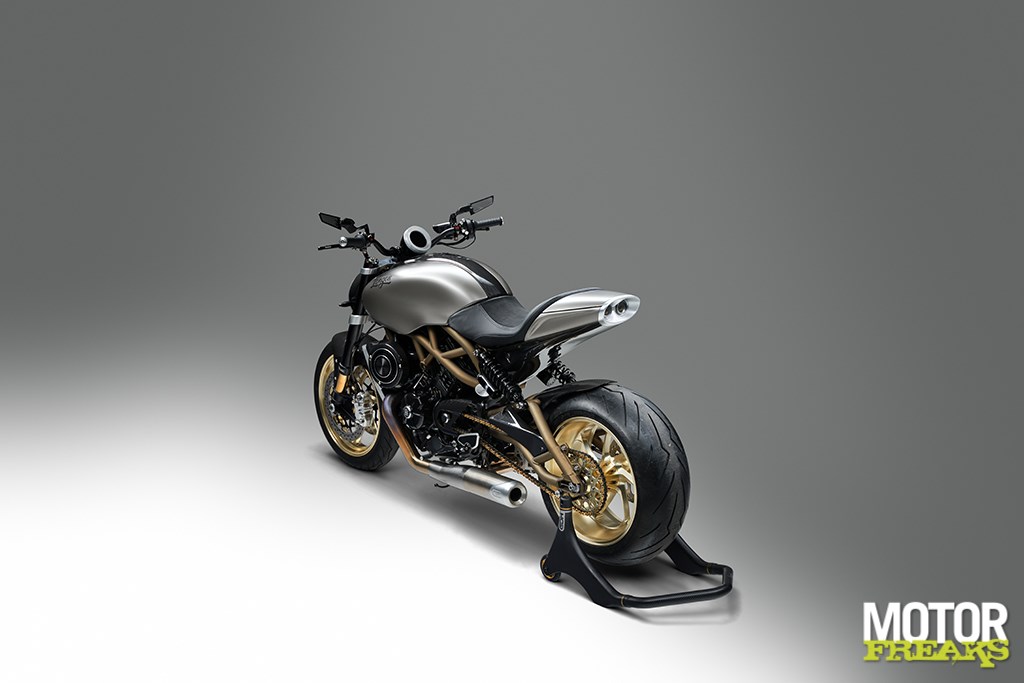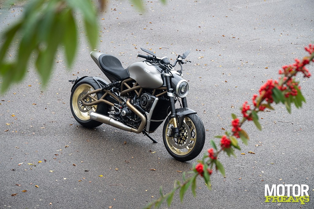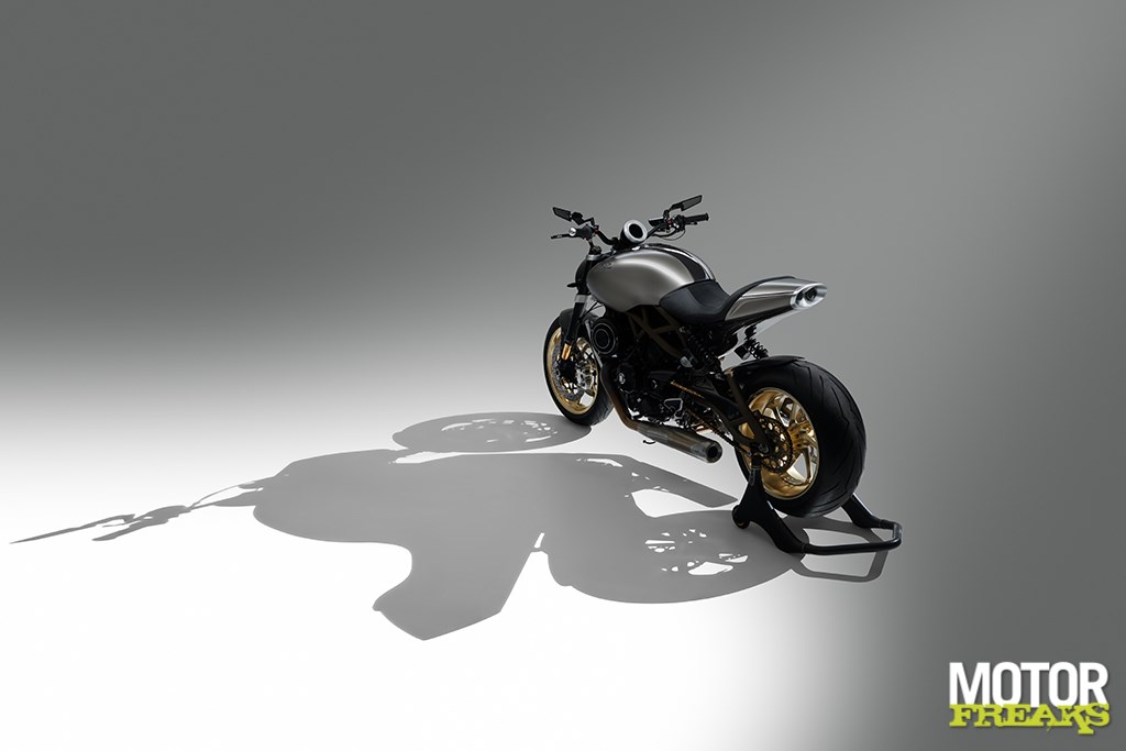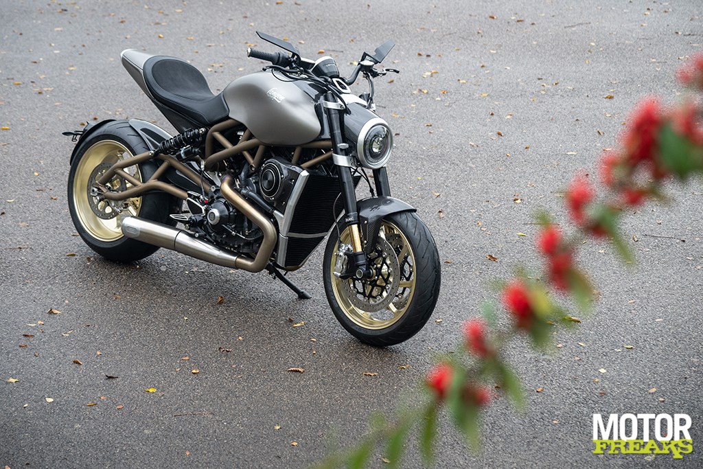 Langen’s eigen prachtig gemaakte 17-inch gesmede aluminium wielen, CNC-gefreesd in eigen huis, zijn voorzien van Pirelli Diablo Rosso III-banden, met een brede 6,00 inch achtervelg en een indrukwekkende 240/45-band. Zithoogte is 790 mm en het CNC-gefreesde ronde TFT-dashboard beschikt over een touchscreen en switchcube-interface. De minimalistische carrosserie is volledig van carbon fiber V-Weave, inclusief de grote kap over de 19-liter metalen brandstoftank.