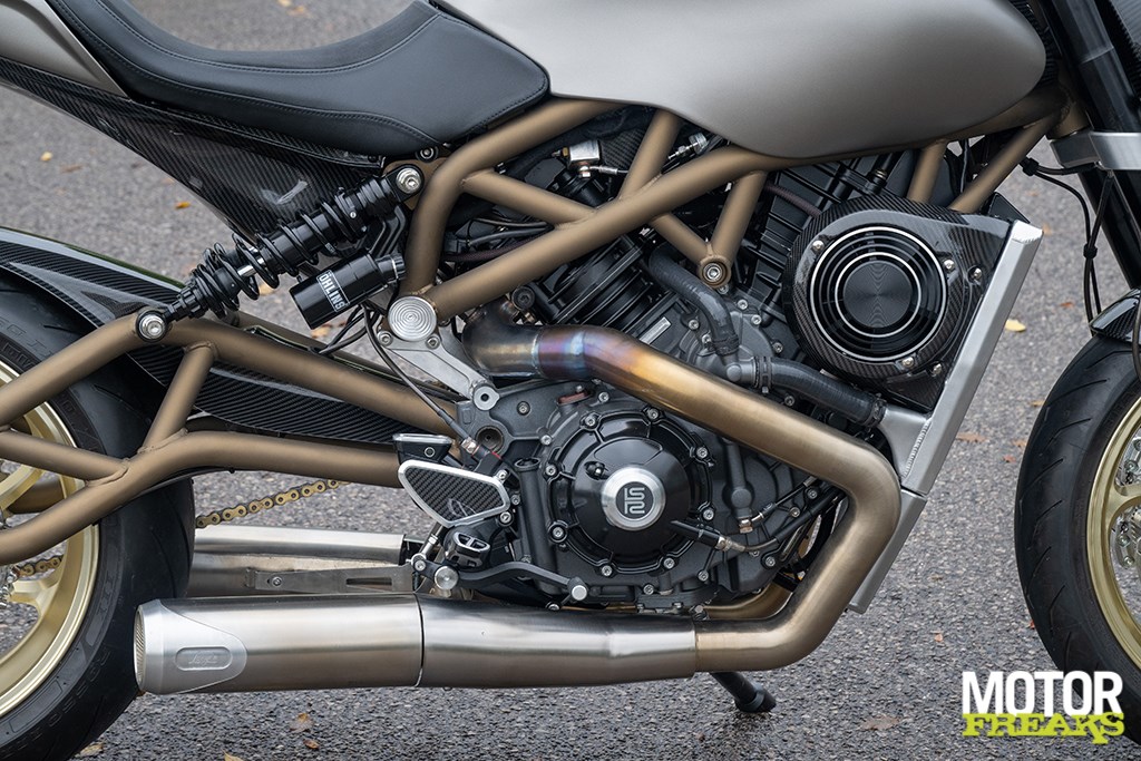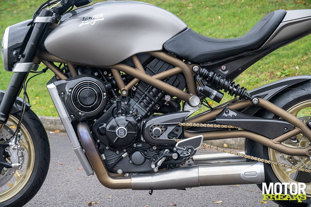 De door Langen getunede motor, direct gekocht bij Buell in Michigan, is voorzien van een in het VK ontwikkelde uitlaat met enorme 60 mm-headers en levert 138 Nm koppel bij 8.200 tpm. Hij heeft dubbele Bosch 60 mm gasklephuizen met elk twee injectoren – een zijdelingse portinjector onder de butterfly en een centraal geplaatste top-injector direct boven de inlaat. De motor wordt aangestuurd door Langens eigen ECU, inclusief instelbare tractiecontrole, wheelie-control, launch control en drie rijmodi: Sport, Touring en Rain.