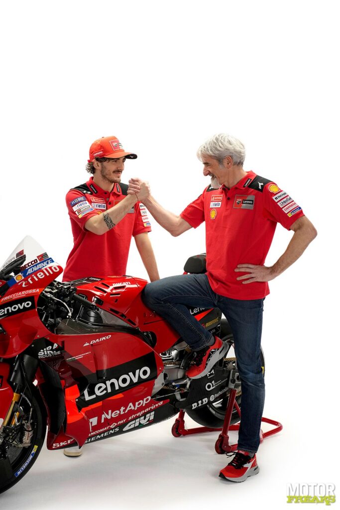 "We zijn verheugd om Bagnaia nog twee seizoenen bij ons te hebben. Sinds hij in 2019 bij Ducati aankwam, heeft Pecco veel talent getoond en het vermogen om onze Desmosedici GP heel goed te interpreteren en zich aan te passen aan het rijden in alle omstandigheden. Hij deed het, vooral in het laatste seizoen, waarin hij een aanzienlijke groei doormaakte en voor de wereldtitel mocht spelen. De manier waarop hij de races in Aragón, Misano, Portimão en Valencia leidde en vier fantastische overwinningen behaalde, is het bewijs van zijn volwassenheid als renner. Met deze geweldige kwaliteiten zijn we er zeker van dat hij het potentieel heeft om samen met ons voor de titel te gaan."