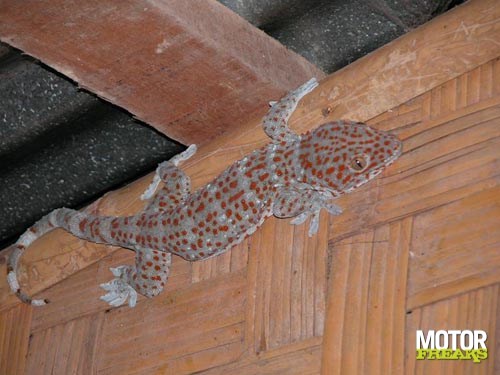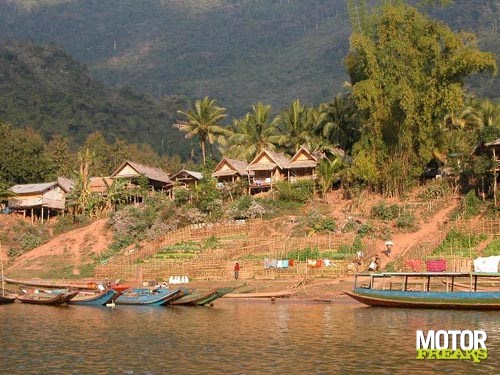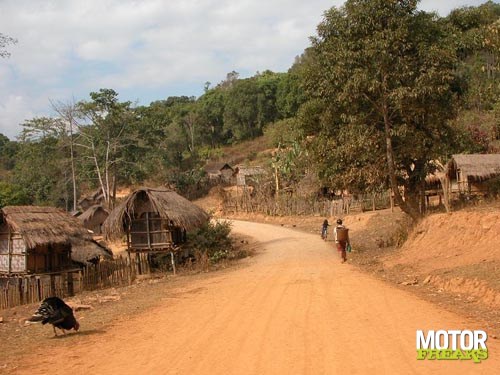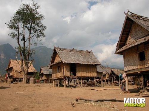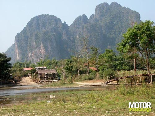 Na Vientiane zijn we naar Vang Vieng gereden. Na wat 'wen-kilometers'valt me op, dat dit toch wel een erg fijne motorfiets is. Voor de duo is het inderdaad iets minder comfortabel, maar wel te doen. Halverwege de rit naar Vang Vieng beginnen de bergen en dan word ik blij. De motorfiets stuurt goed, trekt goed, veert goed en de weg is redelijk goed. Omdat Laos zeer dun bevolkt is, is er ook amper verkeer. Er wonen slecht 6 miljoen mensen in een land dat 8 maal zo groot dan Nederland is. Wel schrik ik, als ik voor de eerste keer een man met Kalashnikov langs de kant van de weg zie lopen. Dit schijnt echter vrij normaal te zijn. Uit de Vietnamoorlog is veel oorlogstuig overgebleven en zo'n Kalashnikov gebruiken ze gewoon om te jagen. Niets om je zorgen over te maken. Het landschap, waar we doorheen rijden is overweldigend. Waar je ook kijkt is het groen, af en toe onderbroken door een klein dorpje. Die dorpjes moet je wel rustig passeren, want er leeft nogal veel pluimvee met zelfmoordneigingen. Kippen doen er echt alles aan om zich voor je voorwiel te werpen. Uitwijken heeft geen zin, want ze zijn nogal snel en wendbaar. De remedie is langzaam rechtdoor te blijven rijden en er het beste van te hopen. Gelukkig hebben we geen kip doodgereden.