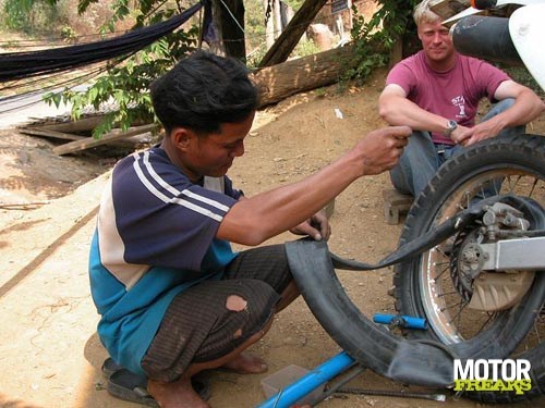 We moeten besluiten hoe we terug gaan rijden naar Vientiane. We kunnen dit meer oostelijk doen of via dezelfde weg terug. Meer oostelijk liggen de papavervelden, daar wenst men geen pottenkijkers en gezien het grote aantal aanwezige Kalashnikovs in dit land, besluiten we maar dezelfde route terug te nemen. Op de terugweg ongeveer 50 km voor Luang Prabang krijg ik in een snelle bocht een klapband. Mijn achterwiel glijdt helemaal opzij, maar omdat de band natuurlijk geen grip meer vindt, worden we er niet met een enorme high-sider van af geworpen. Eindelijk kan ik het geleerde van de slipschool in praktijk brengen en we komen veilig tot stilstand. Wel met een hartslag van over de 200, denk ik. Maar wat nu, motor laten staan en een bus pakken en later de motor komen ophalen? We besluiten eerst maar naar het dichtstbijzijnde dorpje te gaan.