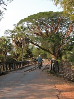 We bezoeken o.a. Champassak. Om hier te komen moet je met een pontje over de rivier. Echter, met een motorfiets mag je niet op de 'gewone' pont, maar moet je op een pontje dat bestaat uit twee kano's met daartussen een houten vlondertje. En om erop en af te komen moet je over twee vrij gammele plankjes rijden. Dat zie ik mij met mijn Varadero niet zo snel doen.