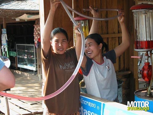 Bijzonder leuk is het tanken. Er zijn geen benzinestations zoals in Europa. Iedereen mag een 'benzinestation' beginnen. Dit bestaat meestal uit 2 vaten (diesel en benzine) waaruit de brandstof omhoog gepompd wordt. Om deze twee vaten is een houten hutje gebouwd, waar dan door de eigenaar een Shell-logo is op geschilderd. Na het tanken wordt de slang afgekoppeld en omhooggehouden, want dat laatste beetje in de slang is ook van jou!
