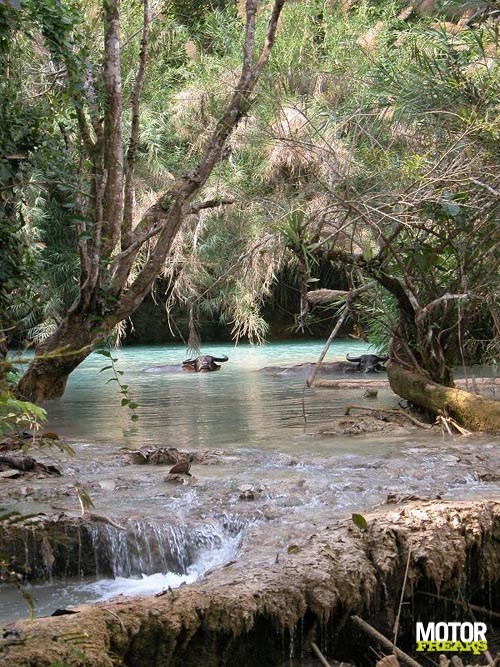 Het is dat zweten echter wel waard. De watervallen zijn echt prachtig. Je waant je in een heus tropisch zwemparadijs. Helder blauw/groen water, dat in etages naar beneden stroomt Mooier dan dit kan het volgens mij niet zijn. Dat vinden ook de waterbuffels, die hun naam eer aan doen en tot hun nek lekker in het water liggen.