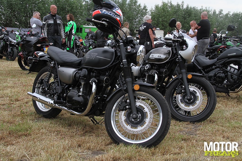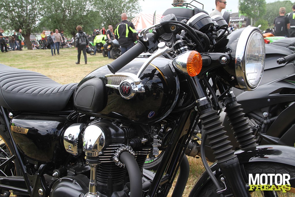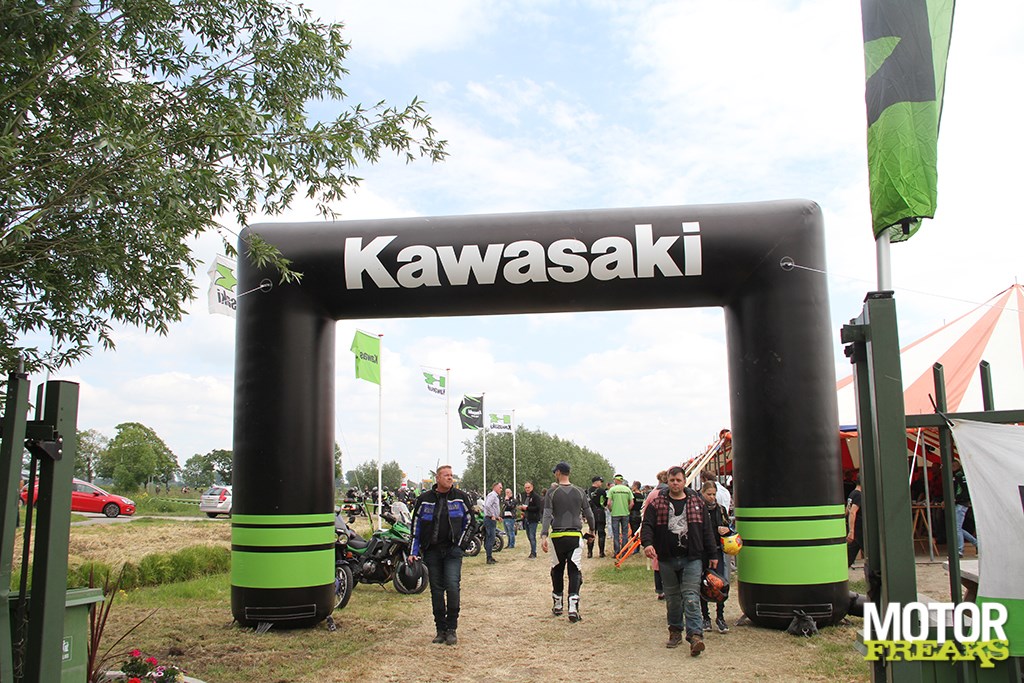 Als we Motorfreaks getrouw redelijk laat vlak voor tweeën op 'onze' W800 Street, waarmee we gaan deelnemen aan de recordpoging, bij Nol Bikker Motoren arriveren is het al een drukte van jewelste bij de gezellige Kawasaki specialist in Noordeloos. De naastgelegen weides zien al groen van de motoren die straks allemaal meerijden met de Kawasaki Tour en met een blokje hout voor de zijstandaard rijdt