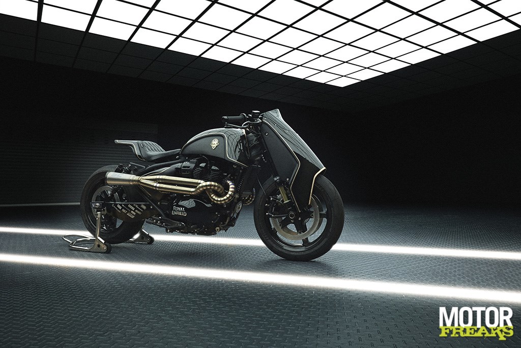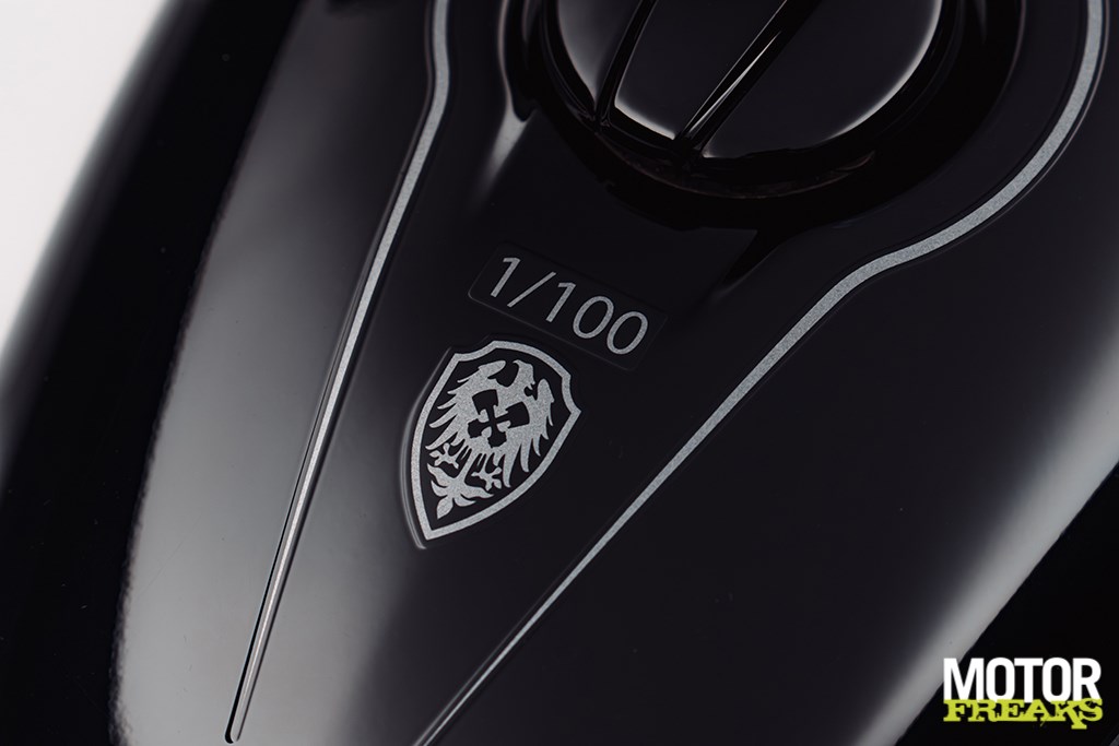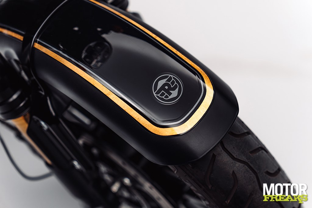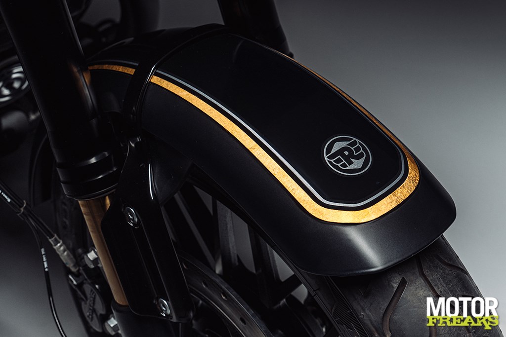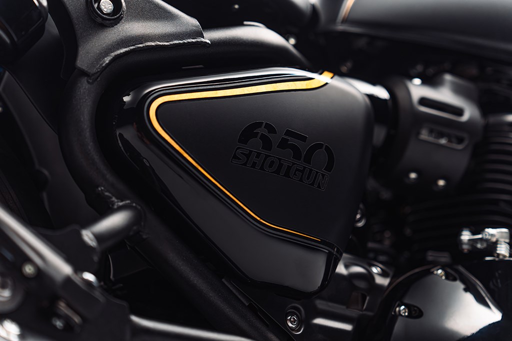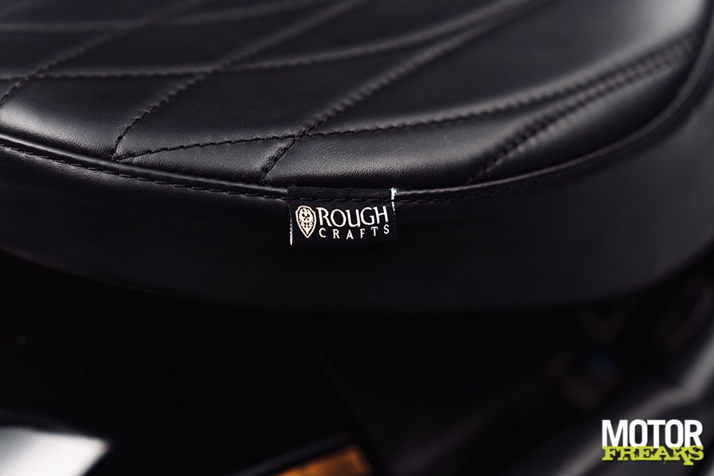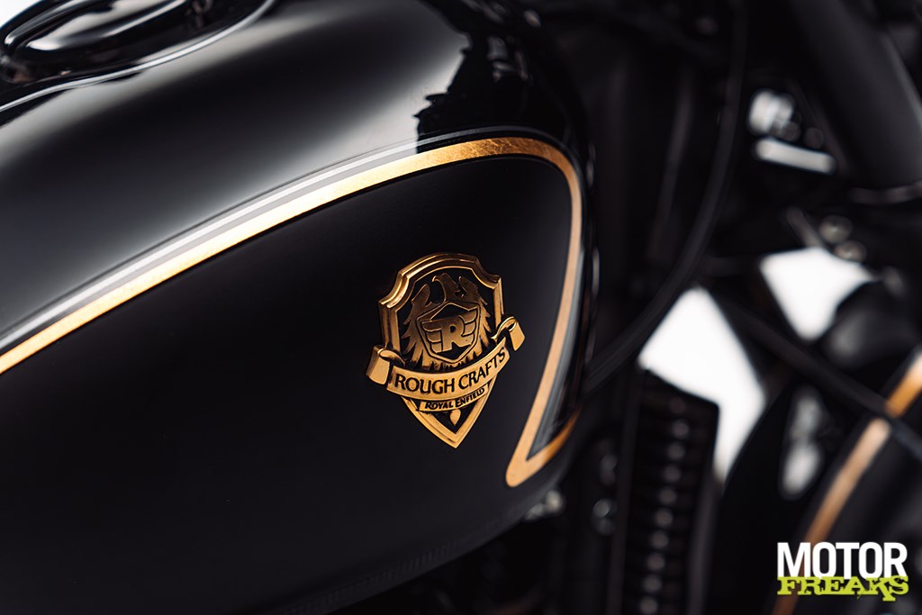 De Shotgun 650 x Rough Crafts valt op door een opvallende streep van echt bladgoud met grijze schaduw over de carrosserie, die de krachtige combinatie van glanzend gitzwart en mat stealth zwart accentueert. Het massief messing, met de hand gegoten tankbadge weerspiegelt de identiteit van de custombuild en benadrukt de exclusiviteit van dit model. Het lederen zadel is met de hand gewatteerd en sluit aan bij het patroon van de originele custombuild, terwijl de gouden binnenbuizen van de voorvork, de contrasterende aluminium velgen en de premium stuureindspiegels het luxe karakter verder versterken.