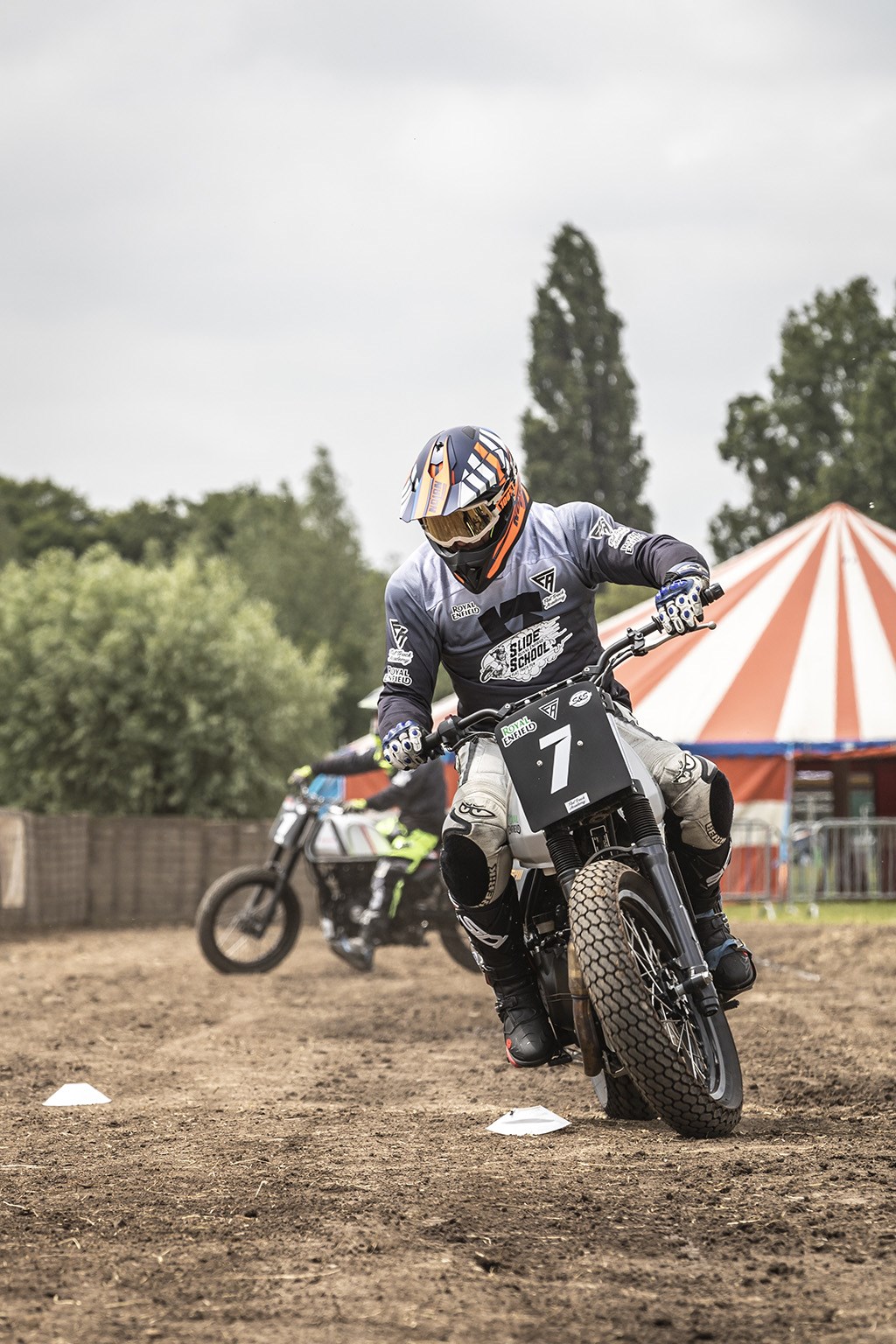 De locatie waar we ons vandaag hebben gemeld is daar het levende bewijs van. We bevinden ons in Noordeloos bij Nol Bikker Motoren, die voor de gekste dingen is te porren en er dus ook geen enkel probleem mee had een wei tot flat track baan om te bouwen. Inclusief grote feestent voor het nodige vertier. Voor zaterdag en zondag staan wedstrijden voor het Nederlands flat track kampioenschap gepland, maar aan ons de eer om op uitnodiging van Royal Enfield Benelux importeur Moto Mondo de vrijdag daarvoor als eersten op de baan te rijden en kennis te maken met de flat track motorsport op een Royal Enfield in vorm van een Slide School training van een halve dag.
