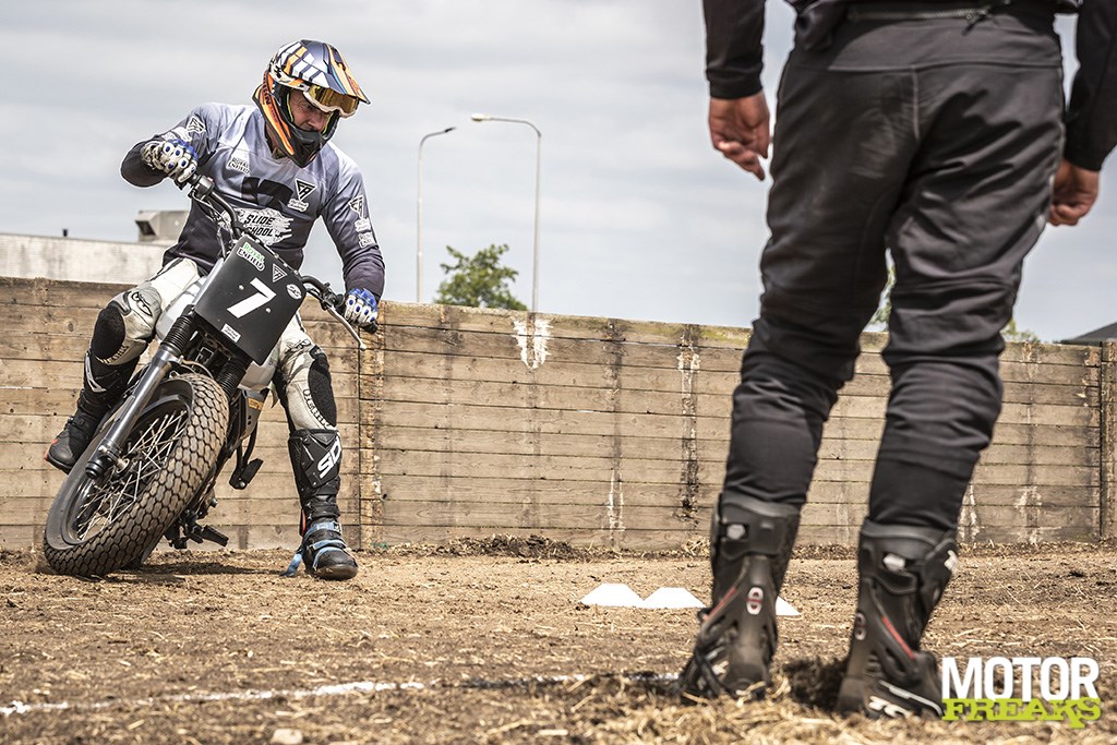 Tot zover de theorie, die echt superlogisch klinkt, maar de praktijk blijkt voor enorme prutsers als uw redacteur een stuk weersbarstiger. De lol is er echter niet minder om. Zelfs de startprocedure met onder andere een juiste dossering van de koppeling wordt geoefend om zo snel mogelijk bij het vallen van de startvlag van je plek te komen en uiteindelijk komt alles aan het einde van de dag samen als we een echte flat track race gaan rijden tegen de andere collega’s. Hoe cool is dat, 4 dik al glijdend richting eerste bocht, daarbij uiteraard alles meteen vergeten wat we de afgelopen sessies hebben geleerd, maar dat mag de pret niet drukken!
