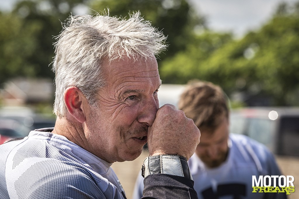 Starten ging goed, nu dit 4 ronden lang vol zien te houden. Dat zal niet meevallen want die nummer 3, da's Maikel zelfgedraaid naar buiten te steken hou je de motor in balans.” Of we het linkerbeen als een derde wiel moeten zien? “Het gaat om de juiste zithouding, niet dat je de linkervoet op de grond zet. Kijk maar eens naar die gasten in het American Flat Track, die raken met hun linkerbeen nog maar amper de grond omdat dat extra weerstand is en dus de rondetijd niet ten goede komt.”