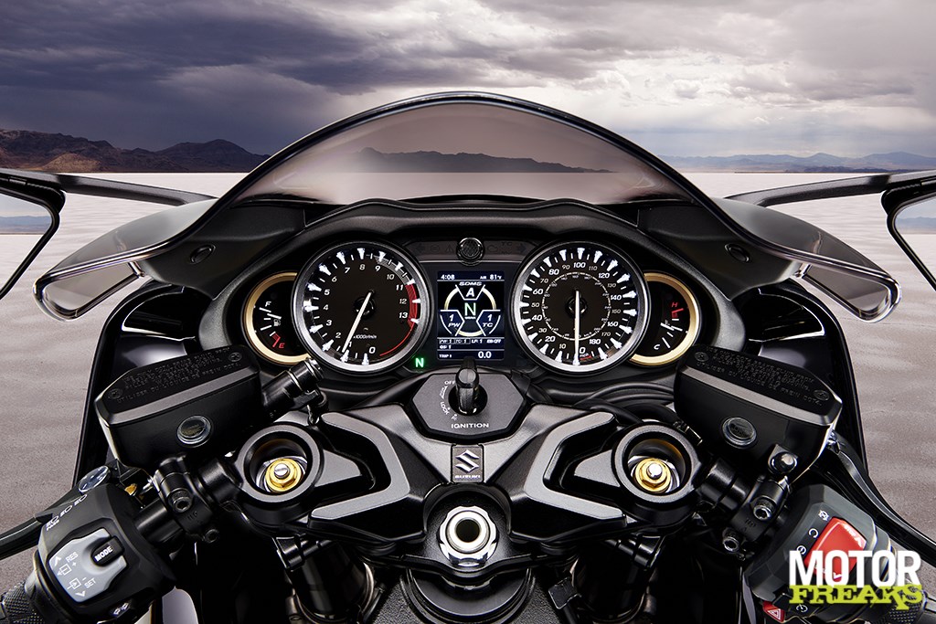 Trouwe fans van de Hayabusa zullen het nieuwe instrumentarium waarderen, met de grote analoge tellers. Daartussen zit een TFT LCD-display dat ofwel de huidige SDMS-α systeeminstellingen toont, of een Active Data-display dat de hellingshoek weergeeft, samen met voor-en achterremdruk, versnelling en de huidige positie van de gashendel.