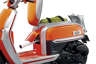Bijzonder aan de Husler Scoot zijn de opbergmogelijkheden. Naast de gebruikelijk opbergruimte onder het zadel en het bagagrek achterop heeft Suzuki nog extra opbergruimte in vorm van een koffer op de vloerplaat aangebracht, die tussen je benen wordt ingeklemd.