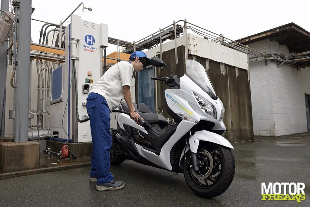 Suzuki's rol in de organisatie is specifiek "Element studie over functionaliteit, prestaties, en betrouwbaarheid van waterstof-aangedreven motoren." Dat is waar het nieuwe Burgman prototype om de hoek komt kijken.