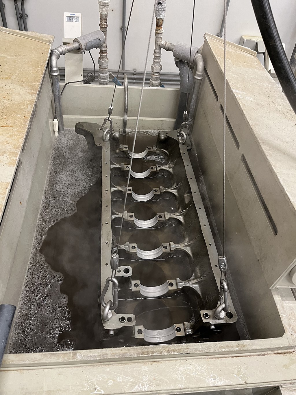 Inmiddels heeft PowerSeal ook een cilinderkopbank aangeschaftNa de ultrasoon reiniging wordt het blok ook nog elektrolytisch ontvet en geactiveerd.