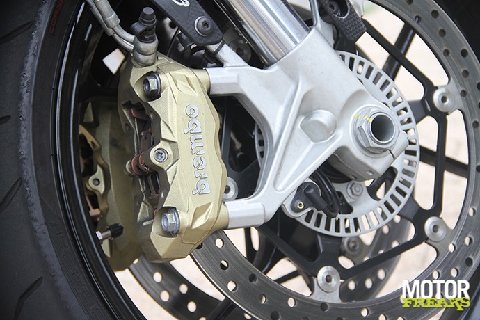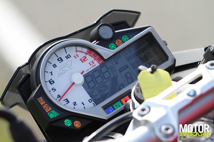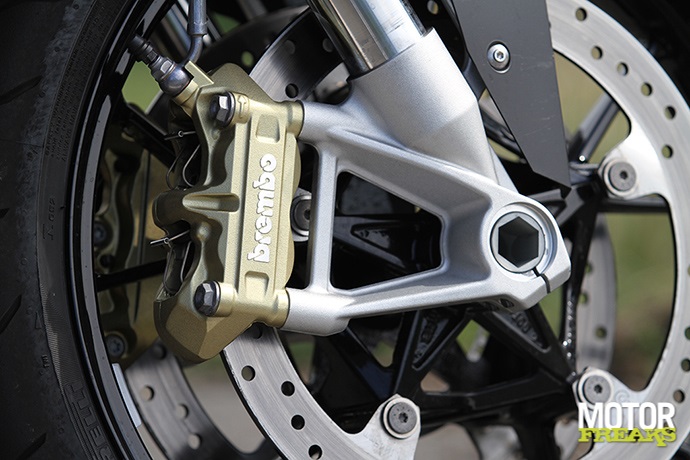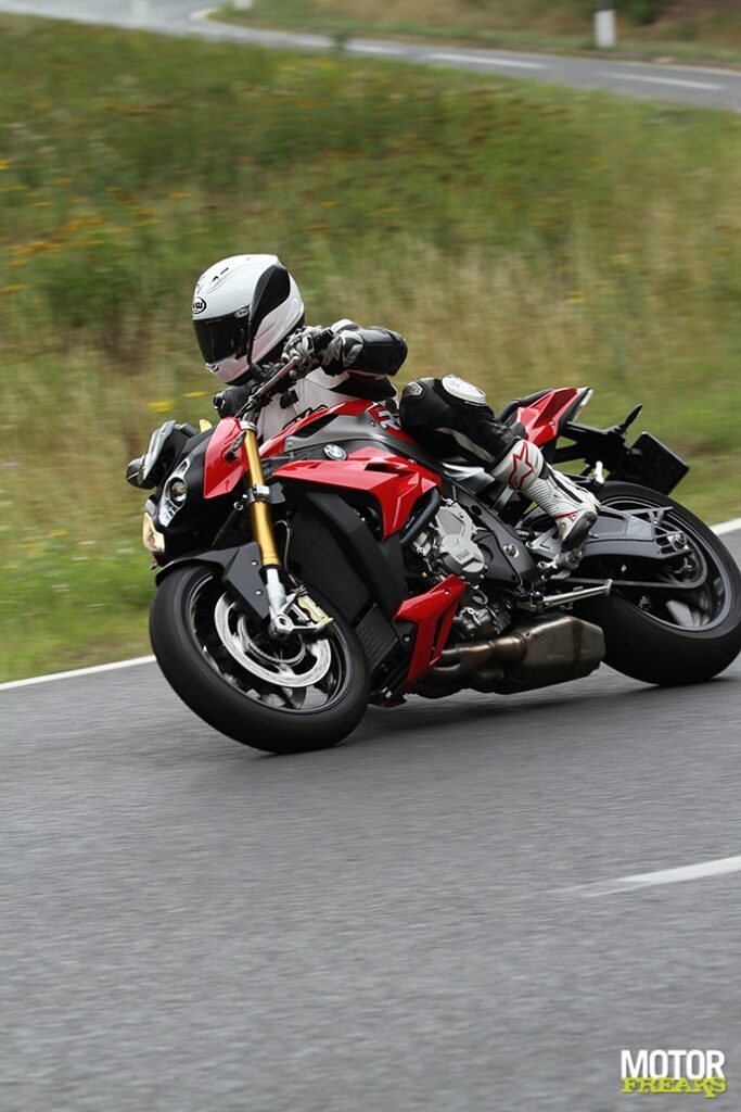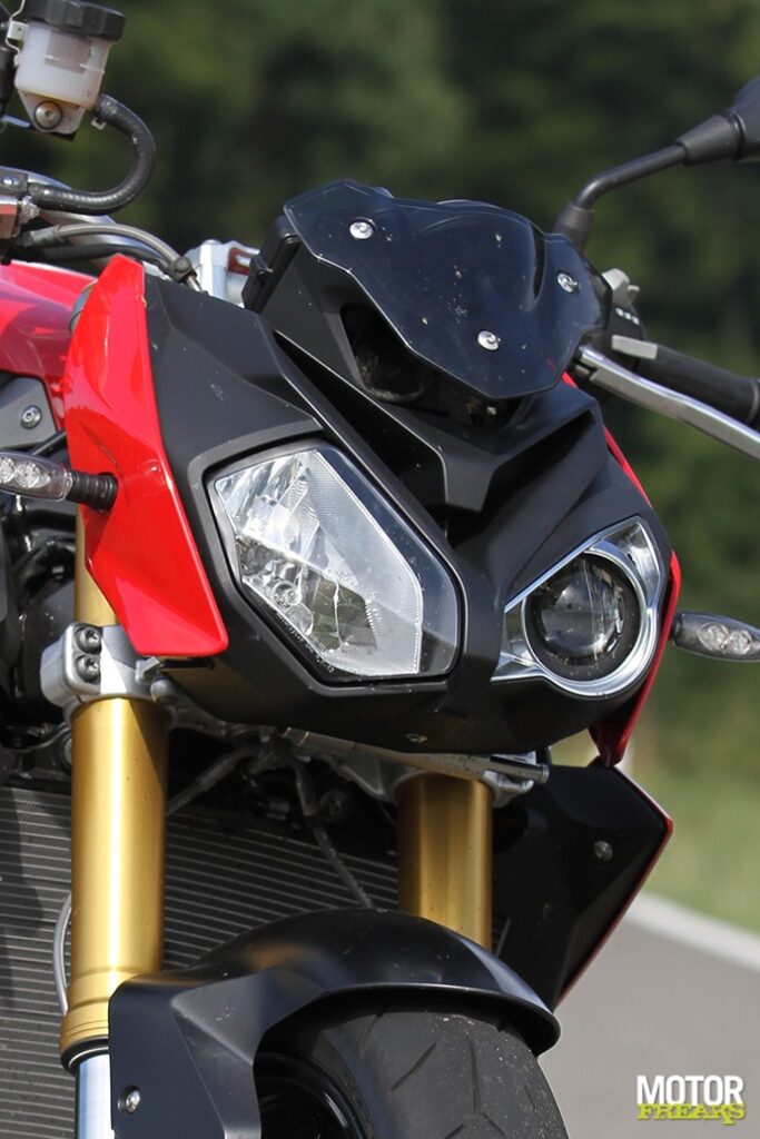 De door BMW gekozen settings voor de Dynamic Damping Control (DCC) semi actieve vering. Standje hard is te hard en standje normaal is al te zacht. Tel daar de gevoelige gasreactie als gevolg van de intimiderende vermogensafgifte bij op en je hebt een wilde tijger die je niet zonder handschoenen aanpakken wilt. Té veel van het goede, en daardoor niet in balans en ontzettend moeilijk om er écht hard mee te rijden. De S1000R is een fiets waar je te allen tijde je kop goed bij moet houden, foutjes worden duur betaald. Ook de windbescherming is niet echt om over naar huis te schrijven (we weten ’t, het is een naked, maar toch), van alle drie is het op de S1000R het meeste afzien. Doordat de voorvork geen goede setting heeft kunnen de remmen nooit optimaal worden benut. De lichte bediening in combinatie met de slappe vork maakt dat een beetje remmen al een agressieve respons geeft en de voorvork op de olie doorslaat. En dan is er nog de prijs, die met alle optiepakketten best fors is. Jammer is ook dat iets basaals als dynamische tractiecontrole in het sportpakket is ondergebracht, in plaats van tot de standaard uitrusting te behoren.