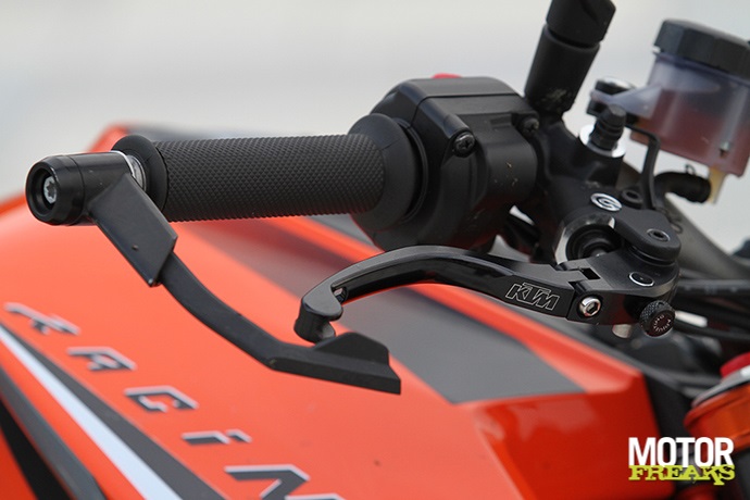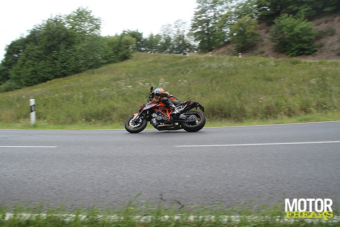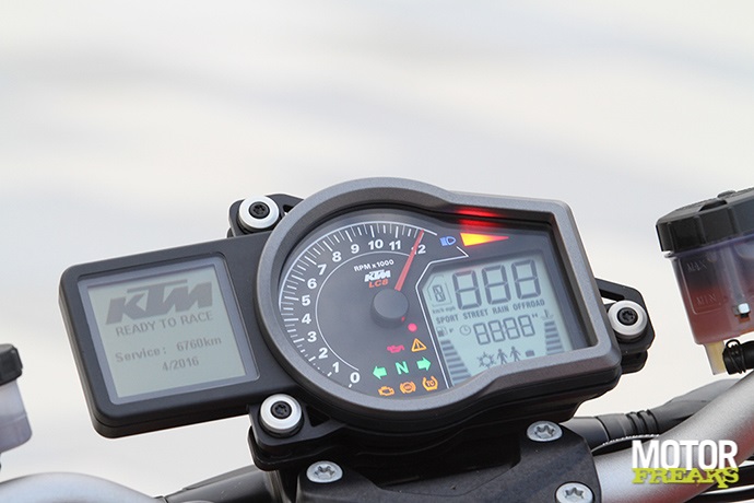 Afwijking in snelheid en tripmeters ligt weliswaar binnen de norm, maar 7,5% is in alle eerlijkheid te veel. De tractiecontrole grijpt in als er een wheelie wordt gemaakt, waardoor je op voorhand een keuze moet maken tussen veiligheid (TC uit) en spelen TC aan). Het uitzetten gaat onhandig diep in het menu en moet elke keer worden gedaan als ‘ie op contact wordt gezet. Wil je écht knallen dan is TC zeker aan te bevelen, zonder TC wordt ‘ie haast onrijdbaar. De versnellingsbak is op zich niets mis mee, maar ten opzichte van de andere twee mis je wel duidelijk de quickshifter. Een auto-blipper zou het aanremmen nog gemakkelijker hebben gemaakt. Ondanks de Akra klinkt de Super Duke erg beschaafd, maar dat zal ongetwijfeld door de dB killer komen.