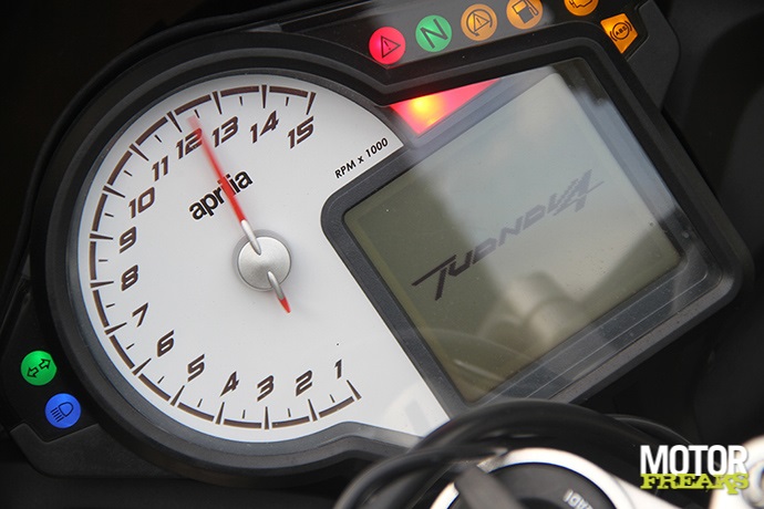 Het verbruik is met gemiddeld 1 op 12 niet meer van deze tijd. Gelukkig dat de tankinhoud enkele jaren geleden naar 18,5 liter is vergroot, daardoor heb je nog altijd een actieradius van een kleine 200 km. Voor alledaags gebruik is de Tuono misschien iets te extreem: het blijft een supersport met halve kuip en Renthal stuur. Het display oogt nog steeds fraai, maar mist wel functionaliteit ten opzichte van de andere twee. De +/- knop kan onbedoeld ook een negatief aspect hebben: Stefan had ‘m ‘per ongeluk’ op TC8 gezet, waardoor ‘ie ineens niet meer vooruit te branden was. Ook is de bediening van het display niet echt handig: gedurende de test is het ons niet gelukt om tripmeter 1 te vinden. Geen auto-blipper quickshifter.