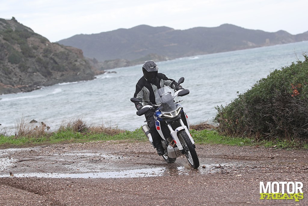 Zou ook kunnen zijn dat er op Sardinië een vloek op Aprilia rust. Bij de Caponord 1200 Rally was het hier 6 zes jaar geleden exact hetzelfde weeromdat ‘ie zowel op straat als offroad goed werkt. Je moet weliswaar een duidelijke schakelbeweging maken om van versnelling te wisselen – zachtjes aaien zoals bij veel motoren met overgevoelige quickshifters is niet genoeg – maar hij doet z’n werk wel nagenoeg foutloos. In het begin was de neutraal moeilijk te vinden, maar eenmaal het blok op temperatuur was dat probleem was uit de wereld.
