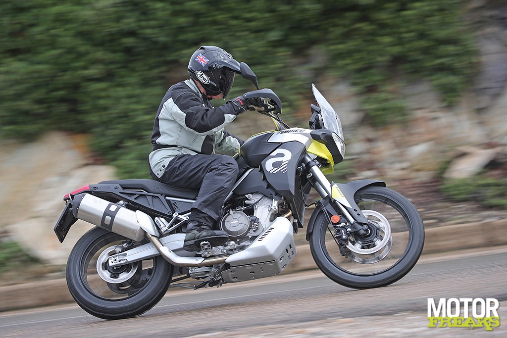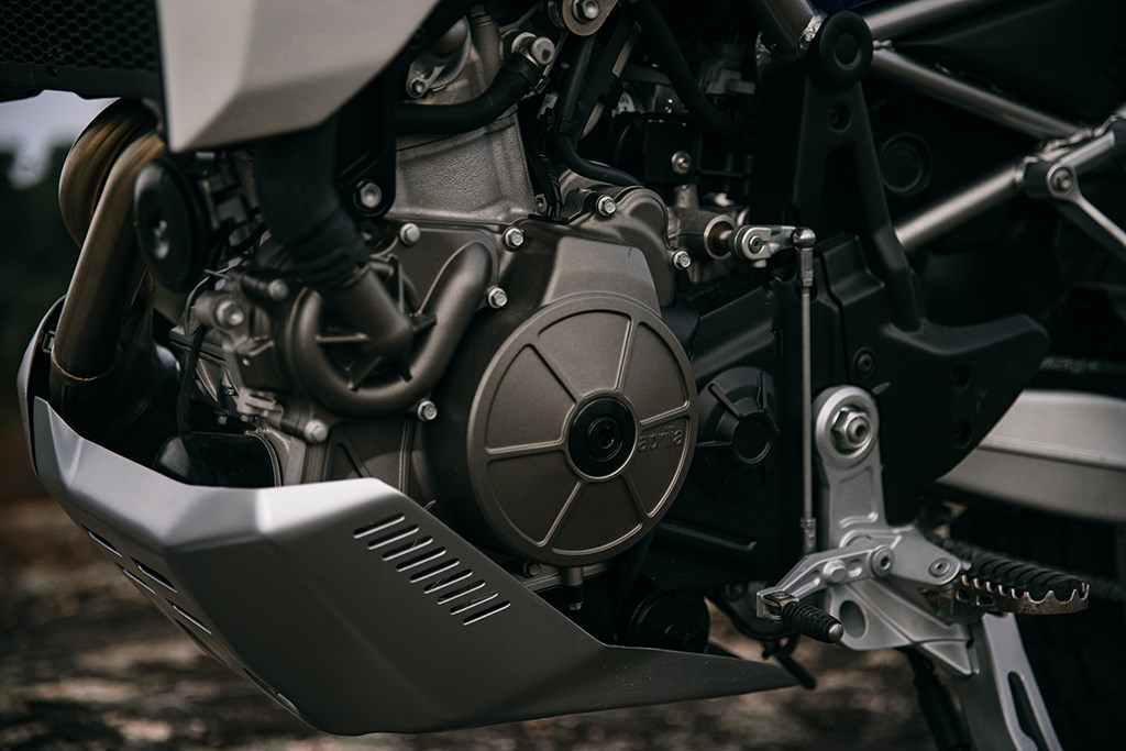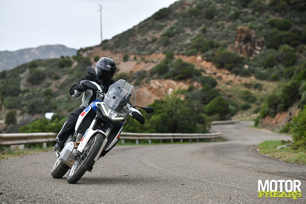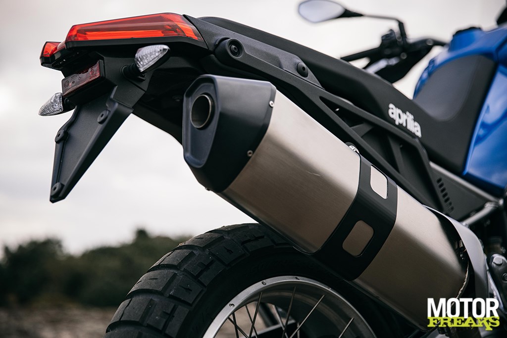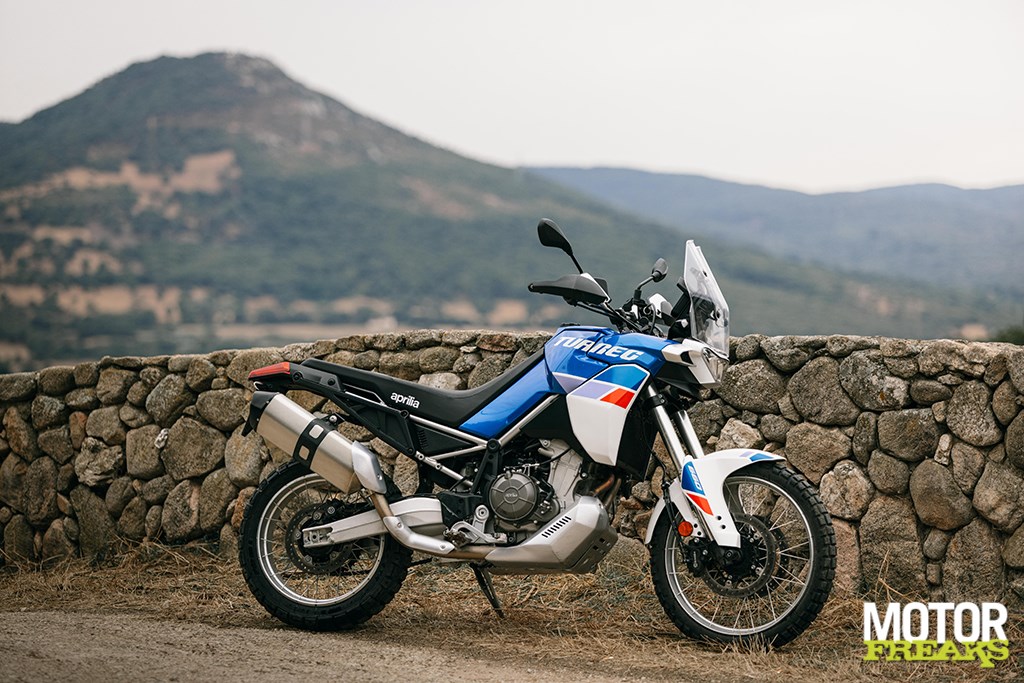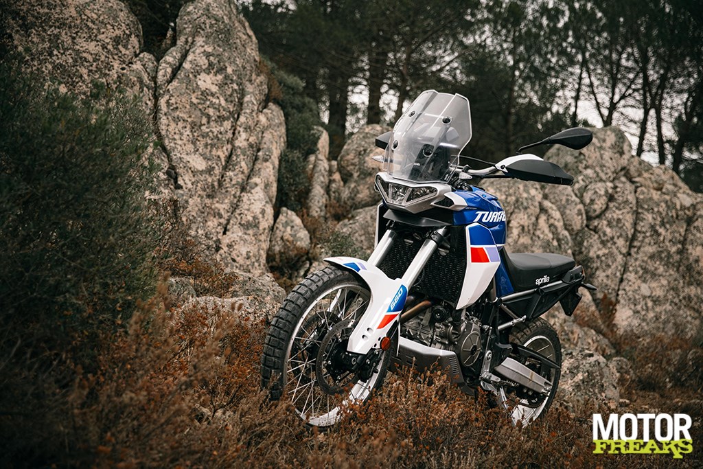 Los van de basisconstructie van de motor is de Tuareg 660 in essentie een compleet nieuwe fiets vergeleken met de Tuono 660 en RS 660. De aanpassingen van de vermogensafgifte en de gearing hebben in een totaal andere rijervaring geresulteerd. De andere twee modellen zijn niet bepaald nietsnutten onderin, maar het extra koppel dat de Tuareg onderin tot z’n beschikking heeft geeft je een extra duwtje in de rug op het moment dat de licht te bedienen koppeling loslaat. Ondanks dat het blok in deze configuratie 15 pk minder levert dan de Tuono, voelt het blok krachtiger. Dat gevoel wordt nog eens versterkt door de rauwe klank uit de centrale luchtinlaat aan de voorkant van de tank, die de 48 mm inlaatkelken van verse lucht voorziet. Totaal niet wat je van een Adventure fiets zou verwachten en het mooie is dat het ook nog eens gewoon aan Euro 5 voldoet.