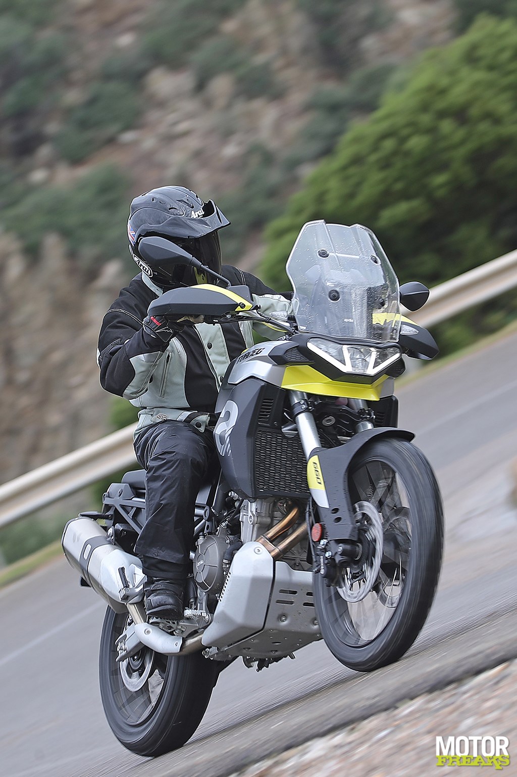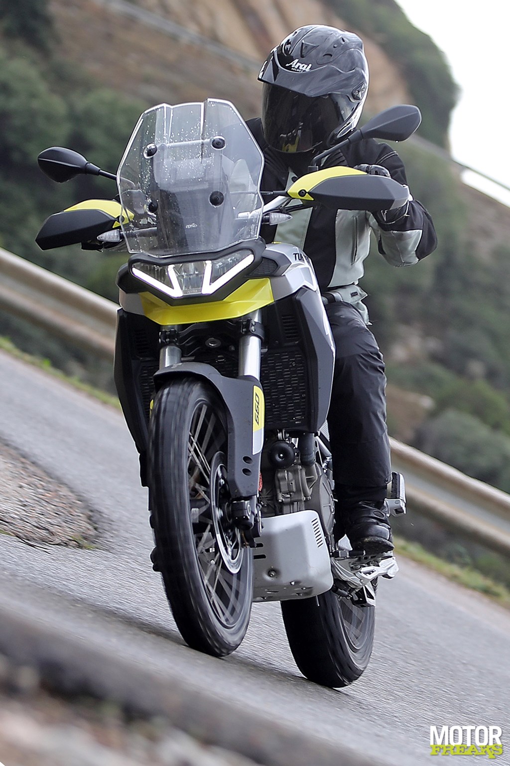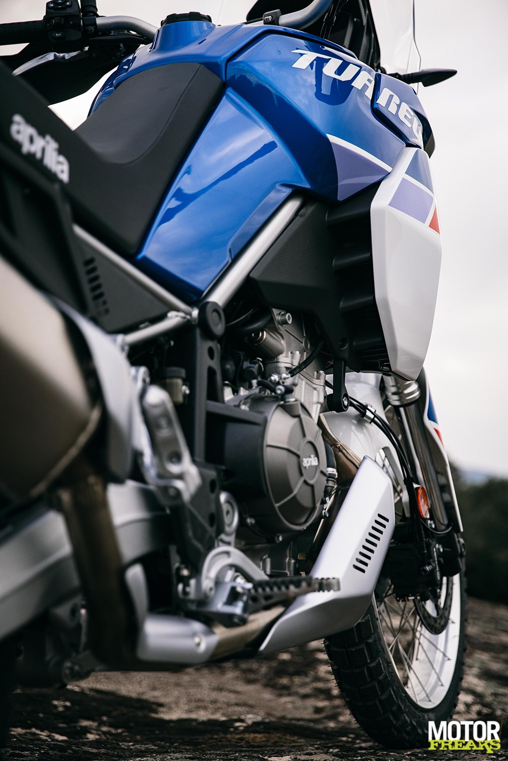 Los van de basisconstructie van de motor is de Tuareg 660 in essentie een compleet nieuwe fiets vergeleken met de Tuono 660 en RS 660. De aanpassingen van de vermogensafgifte en de gearing hebben in een totaal andere rijervaring geresulteerd. De andere twee modellen zijn niet bepaald nietsnutten onderin, maar het extra koppel dat de Tuareg onderin tot z’n beschikking heeft geeft je een extra duwtje in de rug op het moment dat de licht te bedienen koppeling loslaat. Ondanks dat het blok in deze configuratie 15 pk minder levert dan de Tuono, voelt het blok krachtiger. Dat gevoel wordt nog eens versterkt door de rauwe klank uit de centrale luchtinlaat aan de voorkant van de tank, die de 48 mm inlaatkelken van verse lucht voorziet. Totaal niet wat je van een Adventure fiets zou verwachten en het mooie is dat het ook nog eens gewoon aan Euro 5 voldoet.