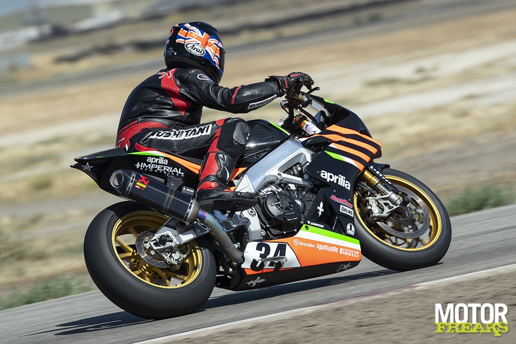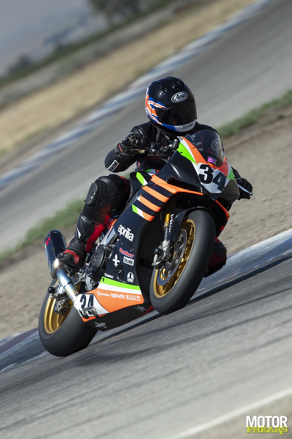 De vierde versnelling van de Pikes Peak gearing was bijzonder effectief op Buttonwillow, dankzij het uitgesmeerde koppel kon ik ‘m een groot deel van het binnenveld in die versnelling houden zonder dat dit ten koste van drive ging. In eerste instantie moest ik mezelf dwingen om alles minstens een versnelling hoger te doen dan ik gewend was, vanwege z’n korte eindoverbrenging, maar de flexibiliteit van de Tuono en het uitgesmeerde koppel dat bij 9.000 toeren piekt bij 122 Nm, maakt het echter veel minder belangrijk in welke versnelling je zit. Doorjagen tot in de begrenzer betaalt zich echter wel uit, omdat er in de vijfcijferige regionen absoluut meer vermogen is.