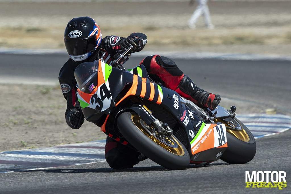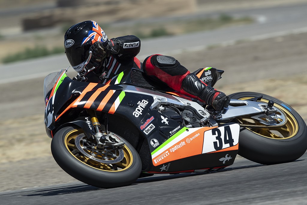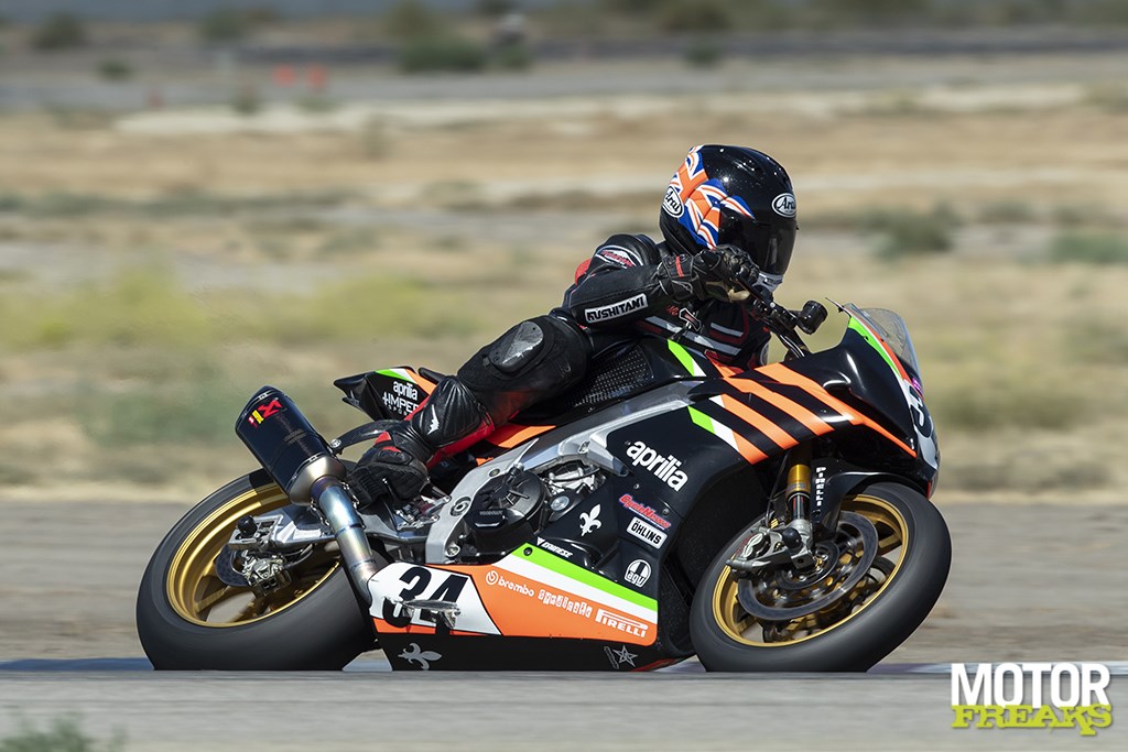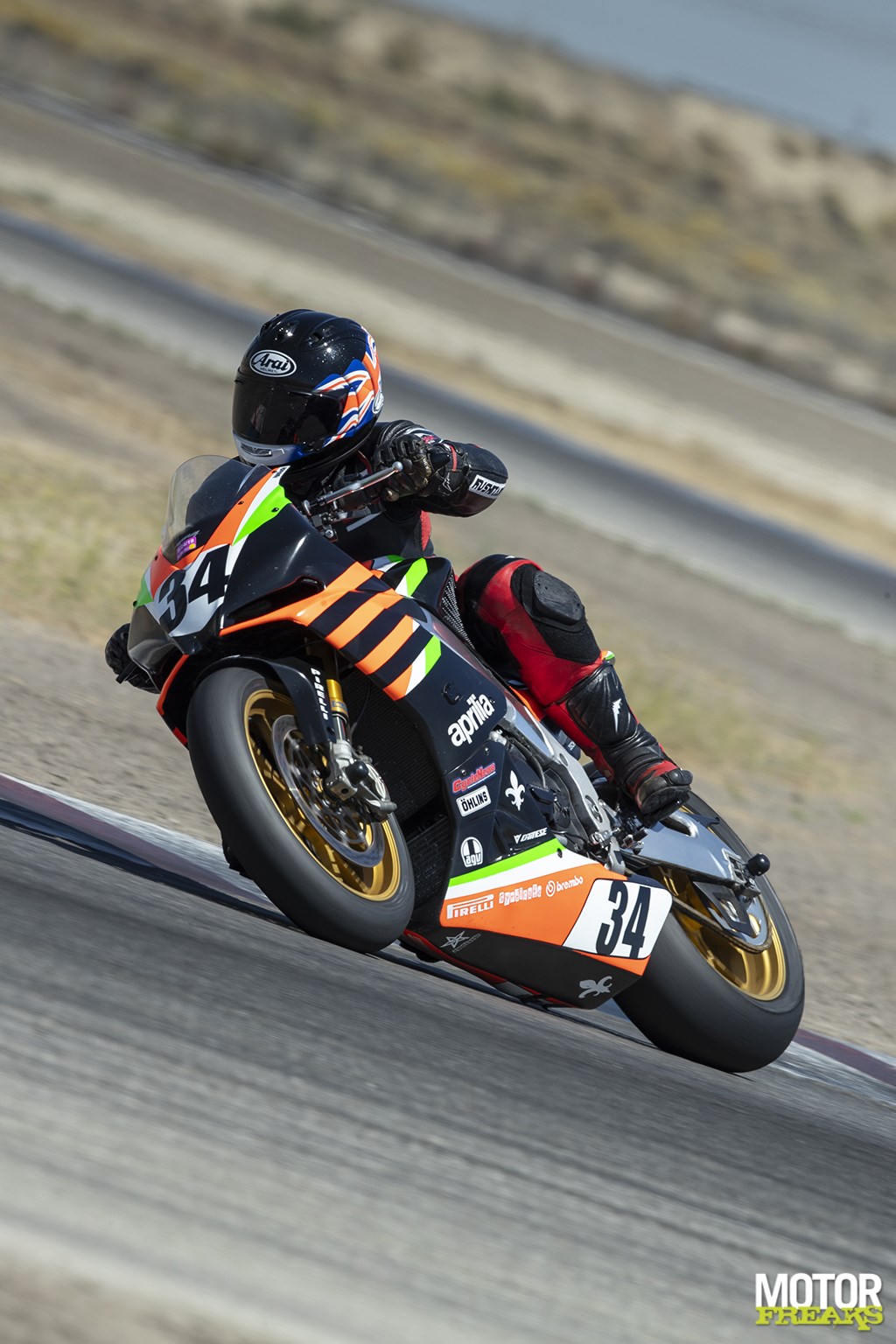 Rennie bevestigde dit met een handjevol shakedown rondjes over het circuit, daarbij tegelijkertijd de nieuwe set superzachte Pirelli Diablo Superbike slicks voor me te scrubben. “Grote dank aan Oscar Solis, de road race manager van Pirelli in Amerika, hij was er altijd om ons te helpen en bekommerde zich perfect om de banden zodat wij ons dar niet druk om hoefden te maken. Hij bleef met nieuw rubber komen om te proberen, voordat ik mijn uiteindelijke beslissing nam om voor een SC0 voor en achter te gaan.” Eenmaal in het zadel voor de eerste van mijn drie 20-minuten sessies op de racer merk ik dat het iets hogere zadel (840mm in plaats van 825mm) de Tuono