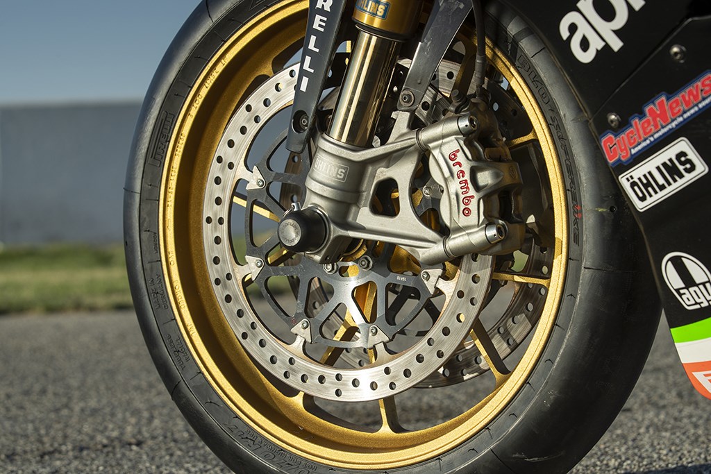 Met een motor als deze heb je geen blauwe pillen meer nodig. Wat. Een. Fiets.gesmede wielen werden gemonteerd, waarbij om het 6 inch achterwiel een 200/60 17 Pirelli Diablo Superbike slick werd gemonteerd. “We waren aan het overwegen om met carbon wielen te rijden, maar dat was uiteindelijk niet nodig omdat het gewichtsverschil tussen de carbon en Aprilia wielen behoorlijk klein was,” zegt Ronnie. “Het was een zorg minder.”