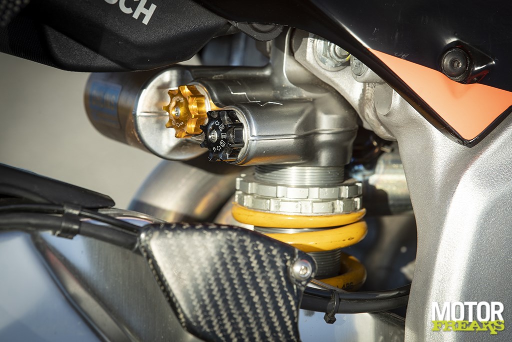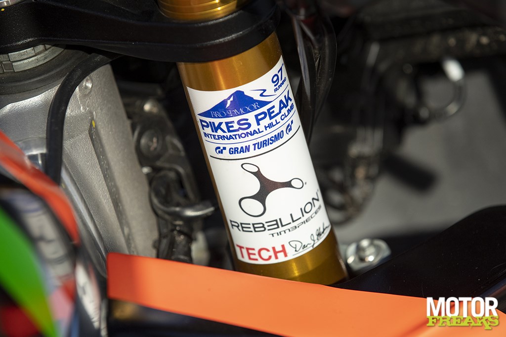 Daarna begon het echter werk. Toye monteerde de 5mm langere volledig instelbare 43mm Öhlins NIX30 voorvork en TTX35 achtershock van een RSV4 Factory. Even werd overwogen om de cartridge kit te monteren, maar dat bleek niet nodig te zijn. “Mijn grootste vraagteken met de Aprilia was dat we niet genoeg grondspeling zouden hebben,” zegt Rennie, “vooral de olieopvangbak onderkuip waarmee we reden. In Pikes Peak is het niet verplicht, maar ik wilde het hoe dan ook voor de veiligheid. Je levert wat aan grondspeling in, maar met de langere vering – de TTX achtershock is ook nog eens 10mm langer – was dat deels weer opgelost. Er zijn een aantal flinke golvingen die de onderkant van de motor behoorlijk schaven wanneer je daarover rijdt, dus moet je de motor zoveel mogelijk rechtop houden en er zelf zoveel mogelijk naast hangen om de schade te beperken. Zelfs de KTM kwam hier grondspeling te kort en die is een flink stuk groter dan de Aprilia.” RSV4 RF