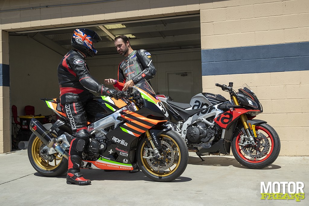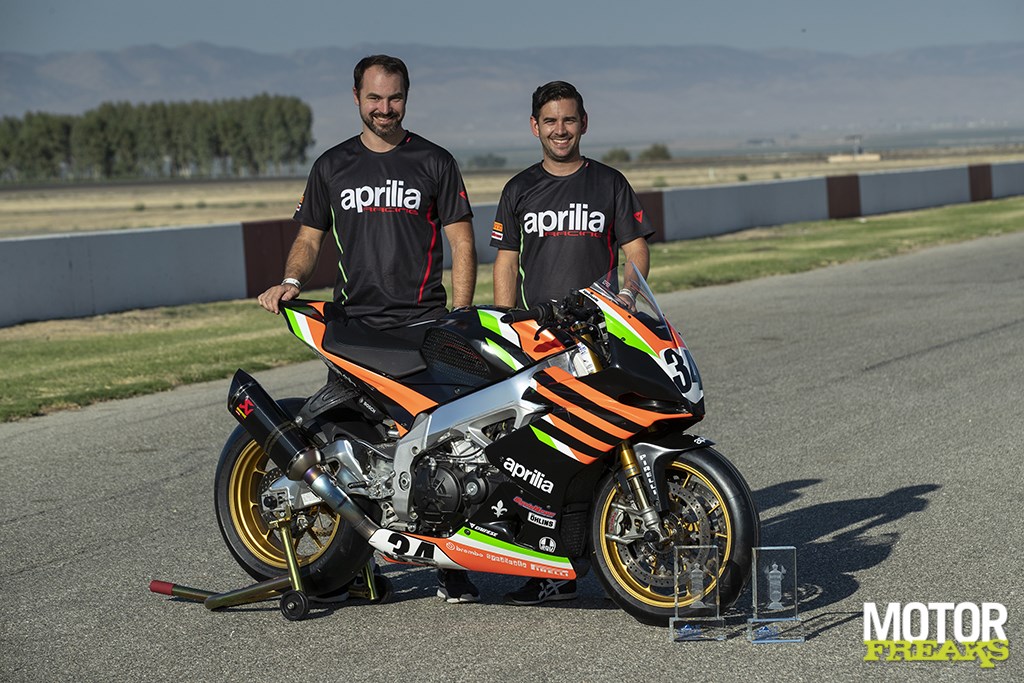 Rennie Scaysbrook (li) en Aprilia USA PR man Shane Pacillo (re)“en de Amerikaanse markt heeft zoveel mogelijk significante evenementen nodig hier in ons Westelijk halfrond, net als in Europa. Dus ik stelde mijn bazen hier en in Italië voor om Rennie te ondersteunen en zij vonden het een goed idee. Rennie vond het zelfs beter – dus we moesten presteren!”