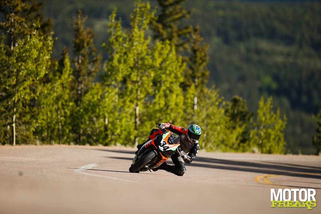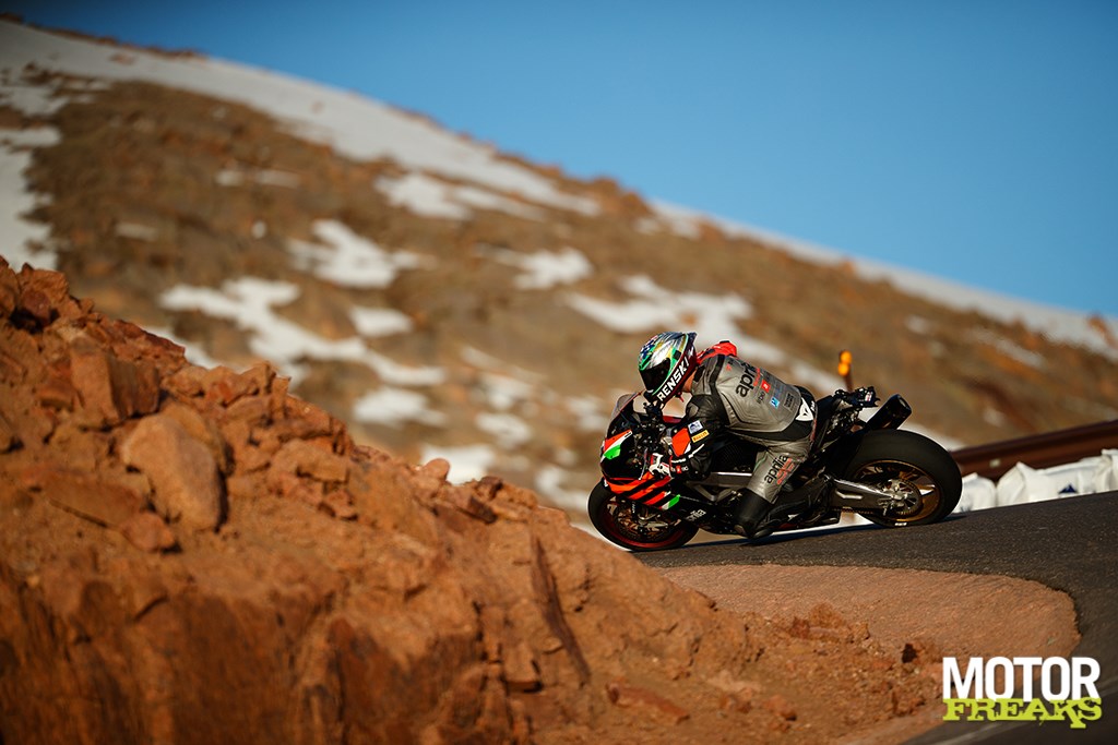 Ondanks de hogere vering van de RSV4 kwam 'ie op Pikes Peak nog steeds grondspeling te kort