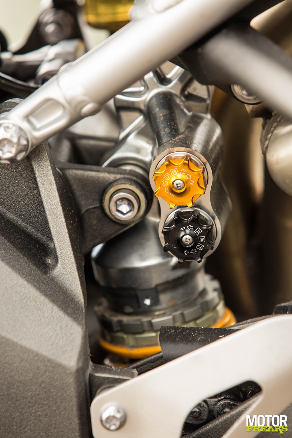 Daar staat ie dan..Die vering hoeft ook niet zo nodig elektronisch, want die doet het prima. Het is een discussie op zich, maar er zijn ook genoeg aanhangers van het aloude schroefwerk en ‘als het goed is, is het goed’ helderheid. Sowieso is de feedback helder zat, dat geldt voor beide motoren. De Triumph hadden we al ontdekt, destijds in Spanje. En ook toen hadden we er totaal geen wensen meer over.