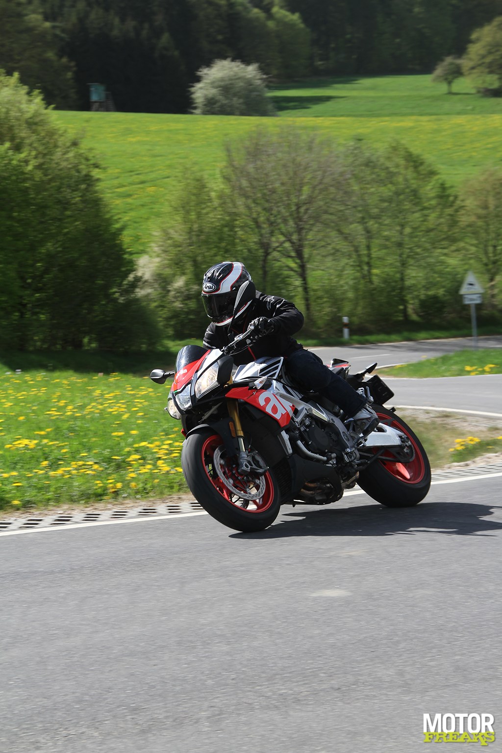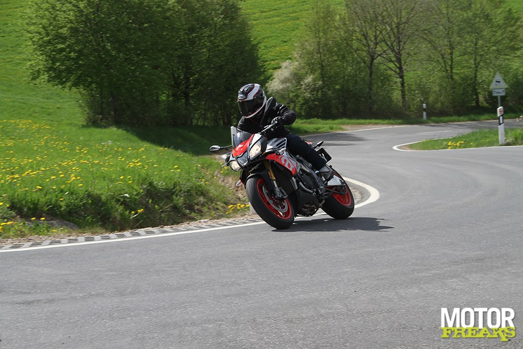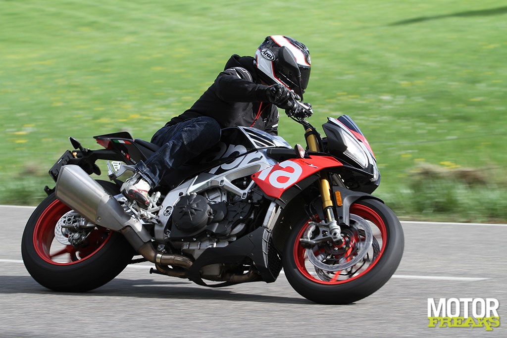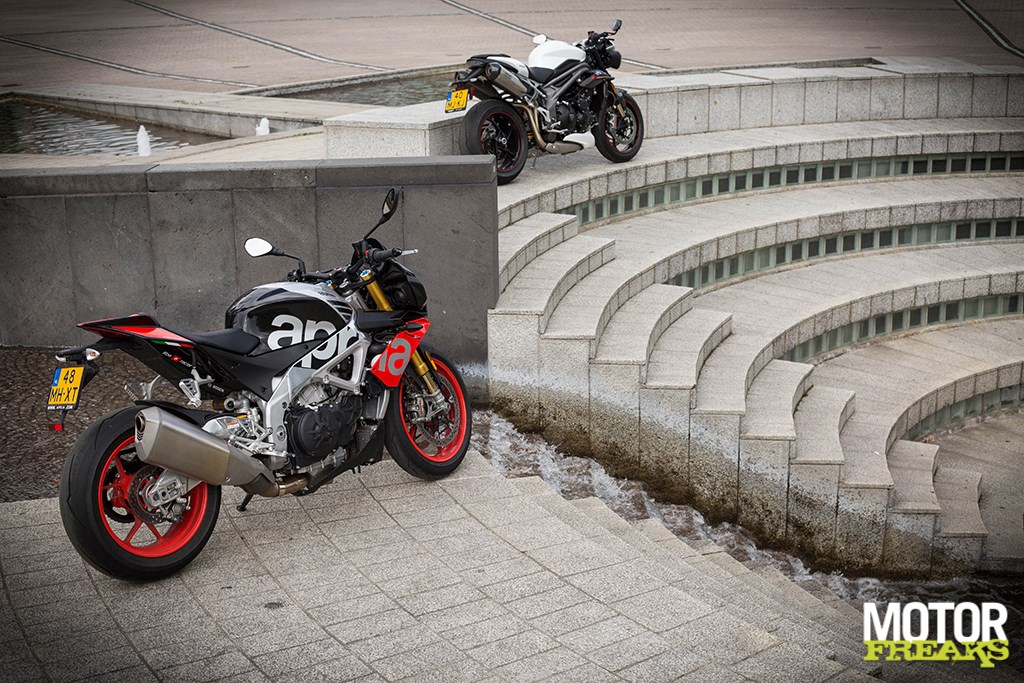 Maar zet er dan geen Aprilia naast. Als er één motor goed is in de spotlight stelen, is het de Tuono wel. En niet alleen met uiterlijk vertoon, het wit van de Triumph steekt nogal gedecideerd af tegen de schreeuwende letters van de Tuono, maar dat voert ook door in de motor zelf. In het rijden, het sturen, de vermogenskromme, alles. Aprilia flikt het gewoon weer, door een motor waar totaal niks mis mee is, volledig te kakken te zetten. Dat is een beetje zielig voor die ander en ook totaal niet de bedoeling van ons om de Triumph af te kraken, zoals gezegd: er mankeert echt helemaal niks aan. Maar zoveel pret en rijplezier is gewoon geen kruid tegen gewassen. En dan is ‘ie nog niet eens perfect.