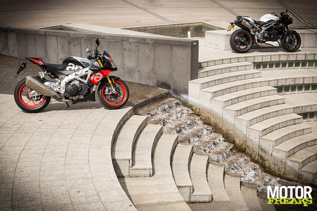Al is het alleen maar om je buurman een plezier te doen. Zelfs met oordoppen in is het een genot om naast de Tuono te rijden als deze schakelt. Of eigenlijk altijd wel; het geluid vanuit de uitlaat is genoeg om totaal geen behoefte te hebben aan een vervangingsdemper. Bijzonder, want uitgerekend de Triumph is –standaard- uitgerust met een setje Arrows. Zo zie je maar weer. Maar goed, het kabaal bij overschakelen maakt de Aprilia dus nóg mooier.