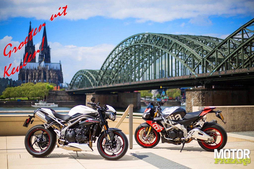 Als Triumph vervolgens met een nieuwe Speed Triple komt die ze zelf de Ultieme Hooligan noemen, moet er veel aan de hand zijn. De introductie voorspelde alvast veel goeds. Maar waar kun je zo’n motor anders nog tegenover zetten dan de motor die al de laatste jaren eenzaam aan de top staat, elke keer als we de eer hebben ‘m mee te mogen nemen? We maken ons op voor een vergelijk dat z’n weerga niet kent. Val met ons mee van de ene in de andere verbazing. Alsof je het in Keulen hoort….