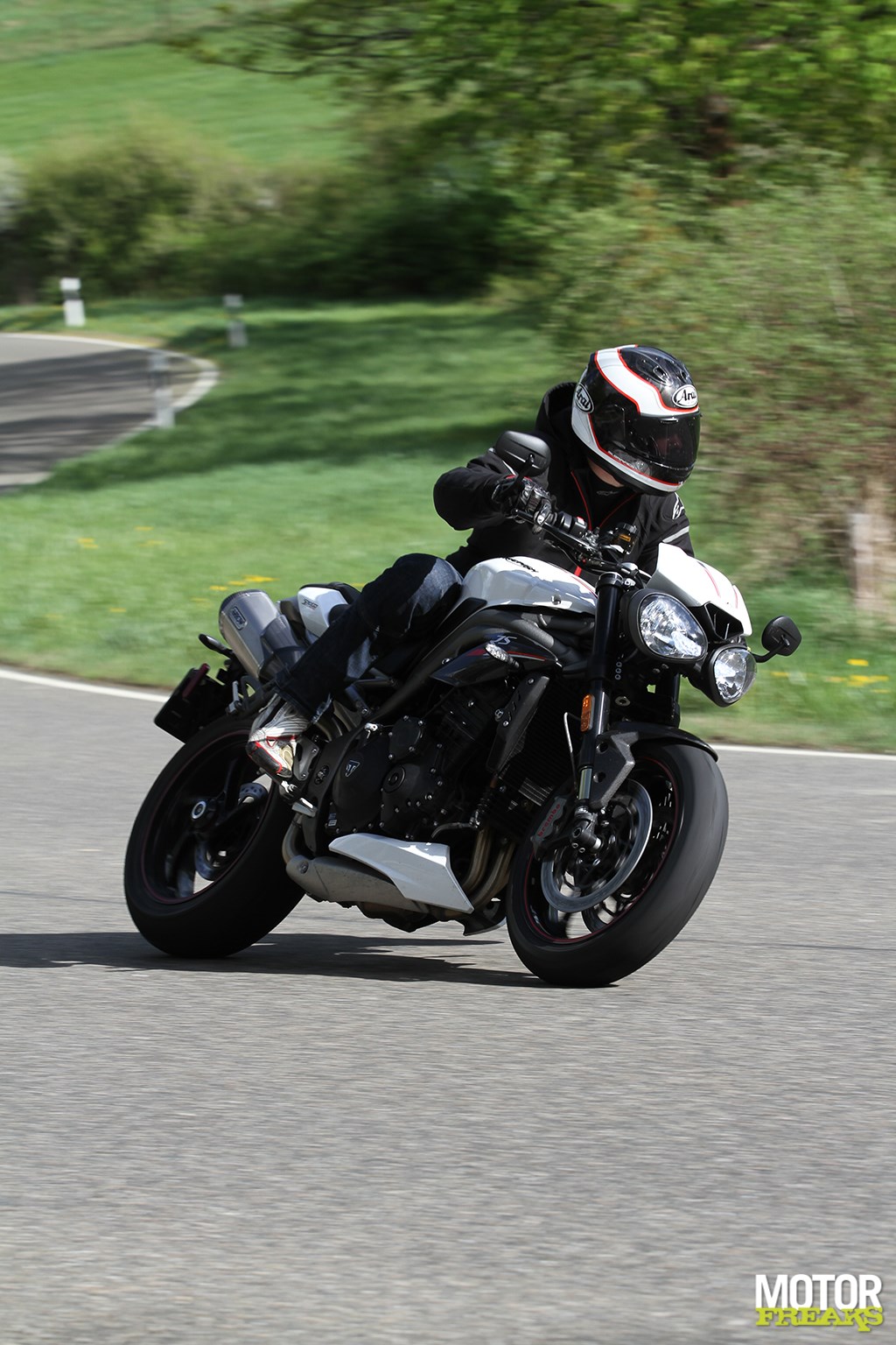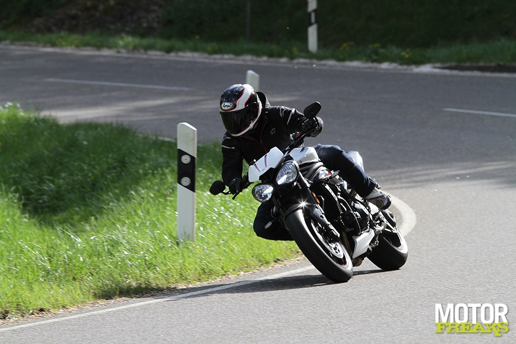 Maar goed, dan nemen we het er nog even goed van. Zo goed mogelijkDat is natuurlijk ook wel inherent aan een driecilinder en dus merk je dat beter aan de 1050 dan aan een 765, maar zo lijkt het net alsof je nooit echt moeite genoeg doet. Aan de andere kant geeft ‘m dat ook wel iets gentlemanachtigs en bovendien maakt dat ‘m ook heel erg geschikt voor ritjes op de openbare weg. En ach, als je dan alsnog je maten kunt bijhouden….