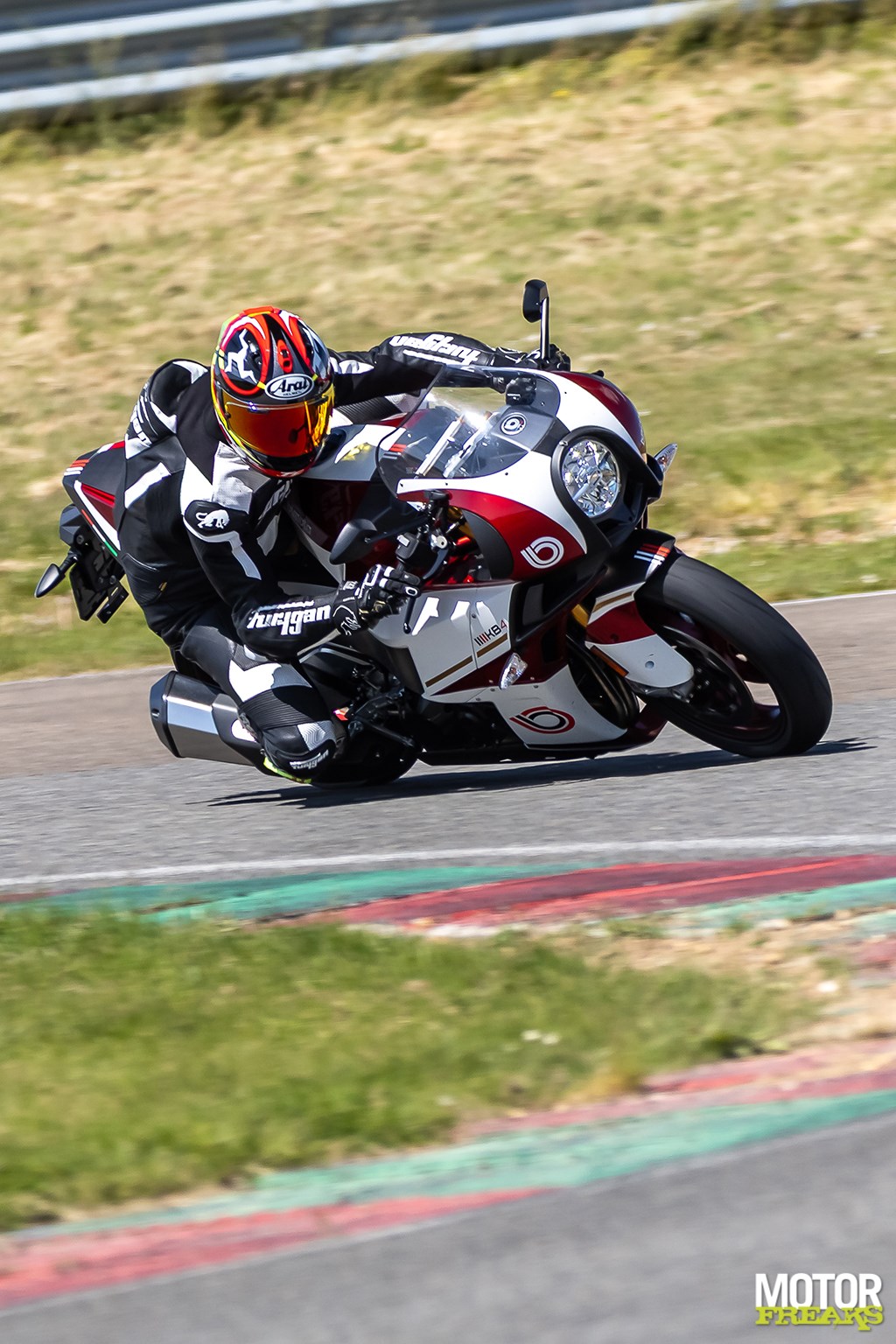 De trip naar Mettet is een ware martelgang. Dat de KB4 ontzettend zwaar stuurt is een ding, maar daar komt bij dat de zit ook nog eens echt super oncomfortabel is. Oldskool oncomfortabel. Hoewel op gelijke hoogte met de kroonplaat in een waanzinnig fraaie constructie zitten de clipons extreem diep en ver naar voren, waardoor er veel gewicht (en daarmee druk) op je polsen rust. Het doet met denken aan de allereerste Kawasaki ZXR750, met die stofzuigerslangen, zó oncomfortabel als ‘ie zit. Terwijl ook hier 'op papier' het helemaal niet verkeerd zou moeten zijn, de zithoogte van 810 mm is helemaal niet extreem. Daarnaast helpt de vering ook niet mee, zowel voor als achter worden zelfs de kleinste oneffenheden keihard doorgegeven,