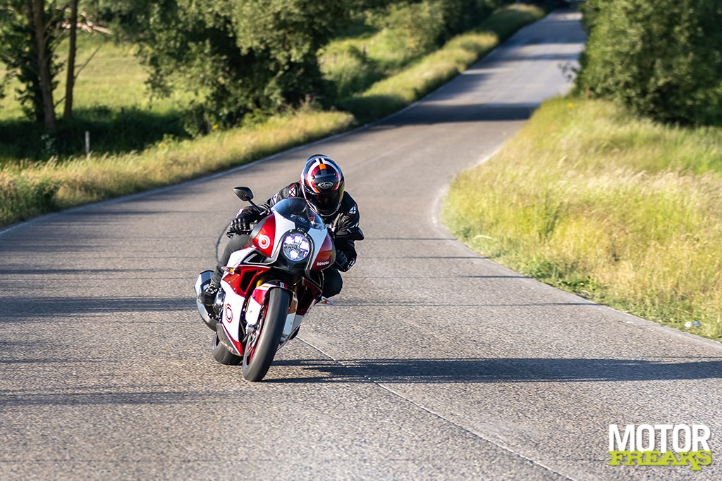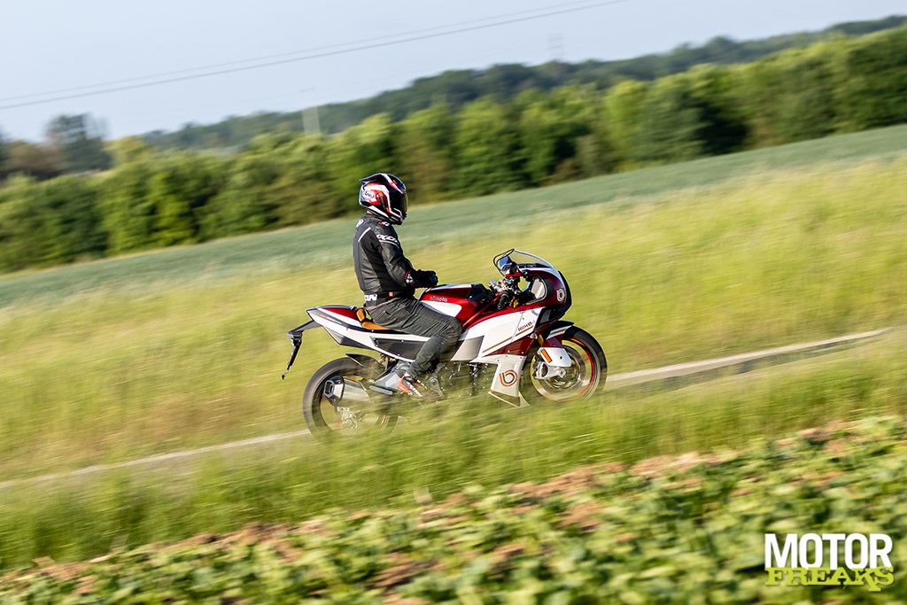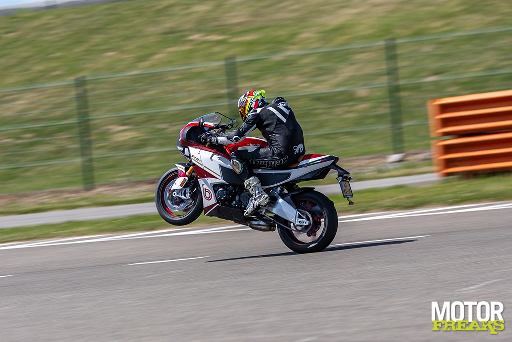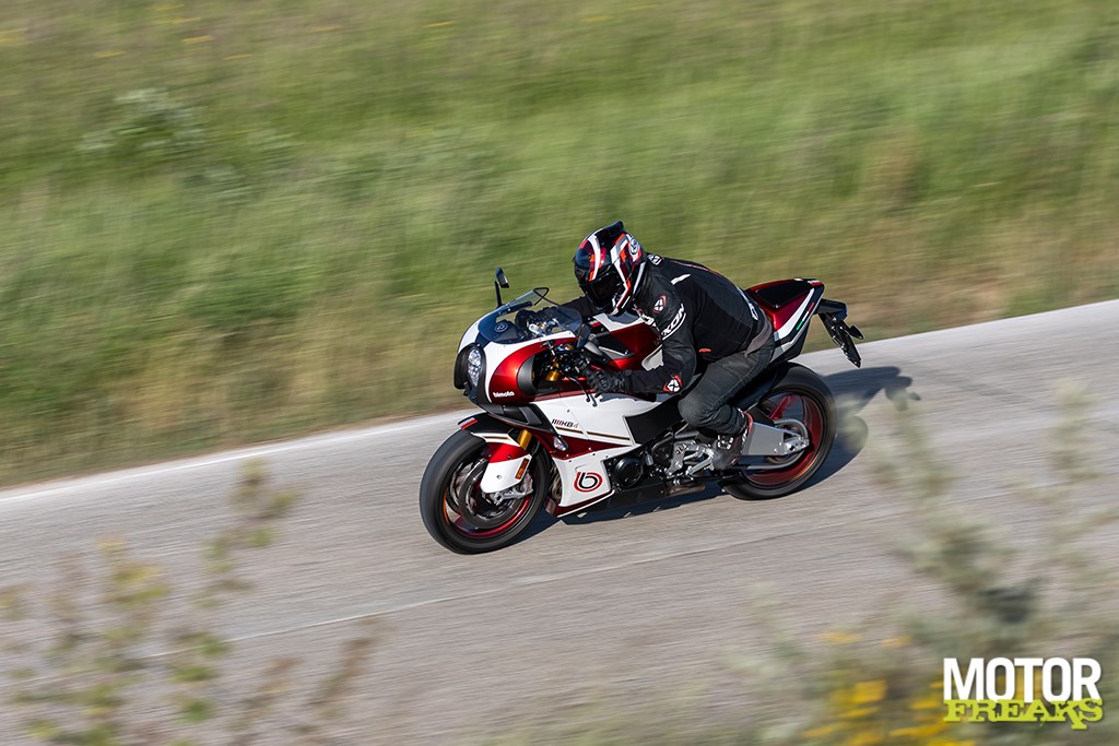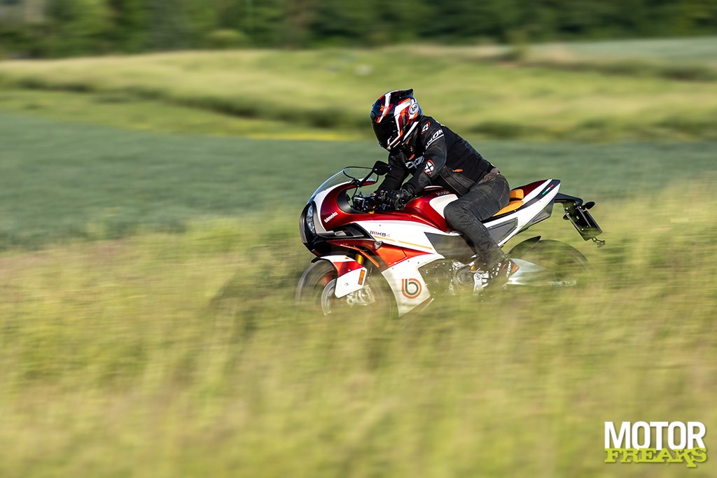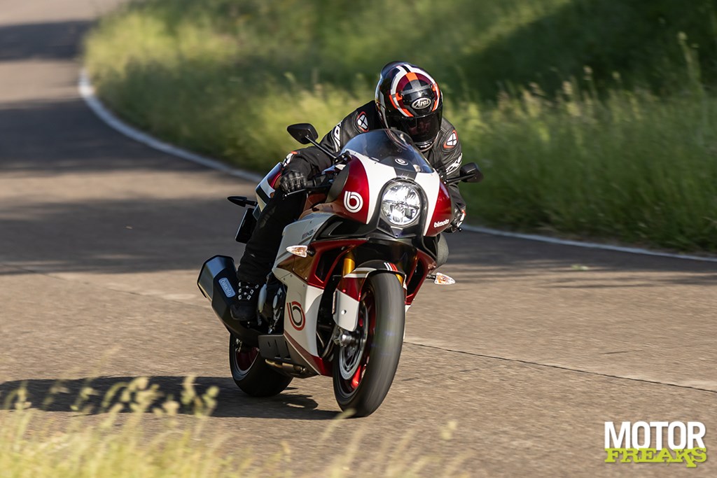 Het enige waar ik wel van onder de indruk ben is het motorblok, dat hoewel in principe overgenomen van de Ninja 1000 SX, echt veel sterker voelt. Geen idee in hoeverre Bimota de mapping heeft aangepast, maar het voelt in ieder geval van wel. Sterker nog, hij trekt er zó ontzettend rap vandoor dat wanneer je zou hebben gezegd dat het blok van de ZX-10R als donorhart was gebruikt ik je meteen zou hebben geloofd. Waar we op de snelweg echter het meest van in onze nopjes zijn is het feit dat de fiets – net als de 1000 SX – standaard met cruise controle is uitgerust, wat het rijden een heel stuk comfortabeler maakt. Cruise aan en heerlijk rechtop zitten zonder dat je per sé je rechterhand aan het stuur moet houden.